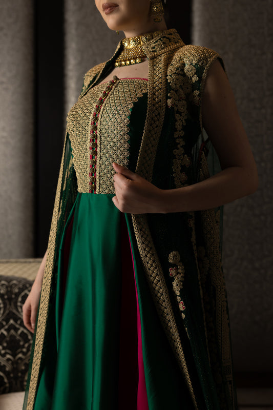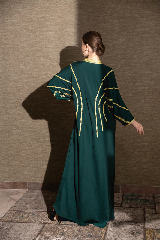 ثوب عروس أخضر لليلة الحناء بحاشية ملونة - مكون من قطعتين