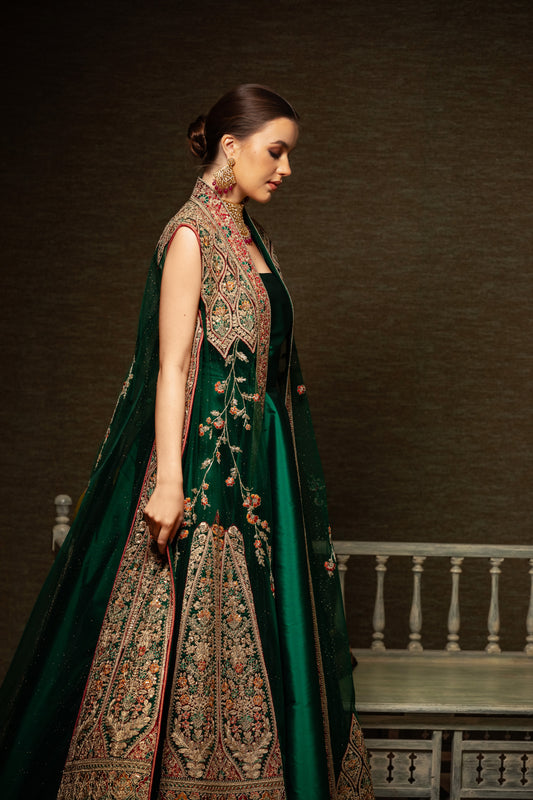 ثوب عروس أخضر لليلة الحناء بحاشية ملونة - مكون من قطعتين