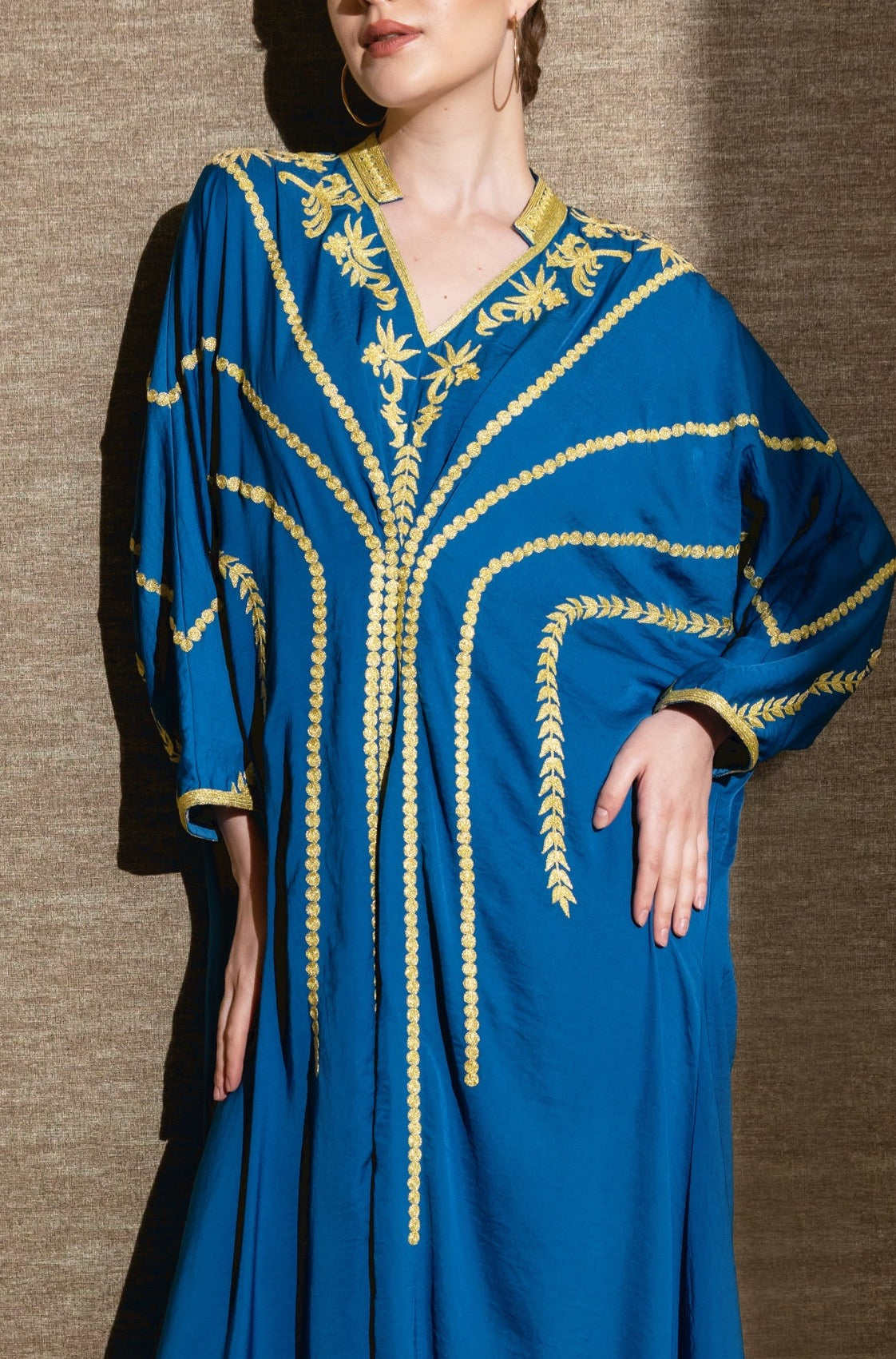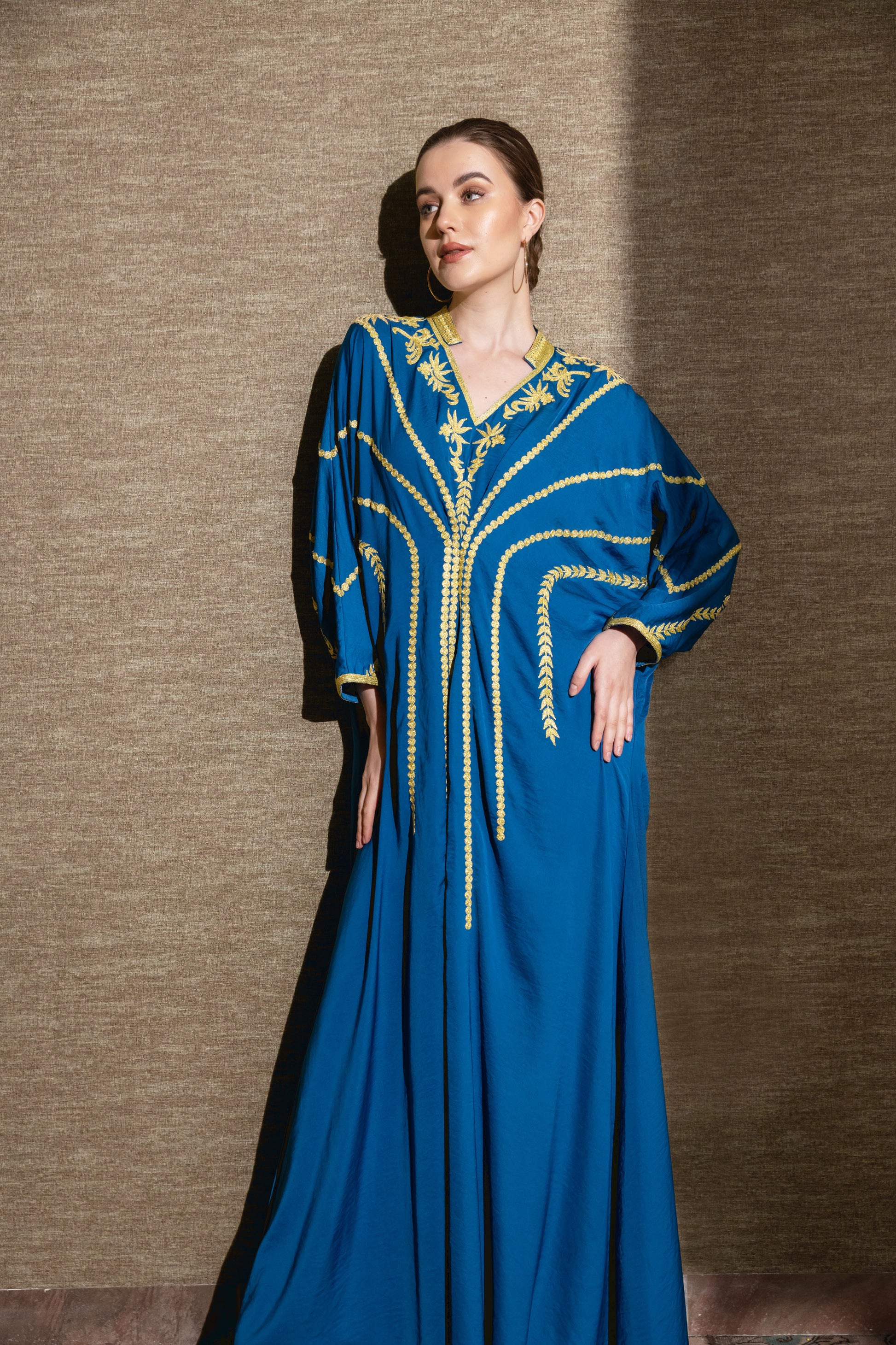 يتميز هذا الفستان الأنيق بسحر خالد مع تطريزه الرائع بخيوط ذهبية في التطريز العربي التقليدي والأكمام الفضفاضة العصرية. تباهى بها في التجمعات والمناسبات الخاصة!