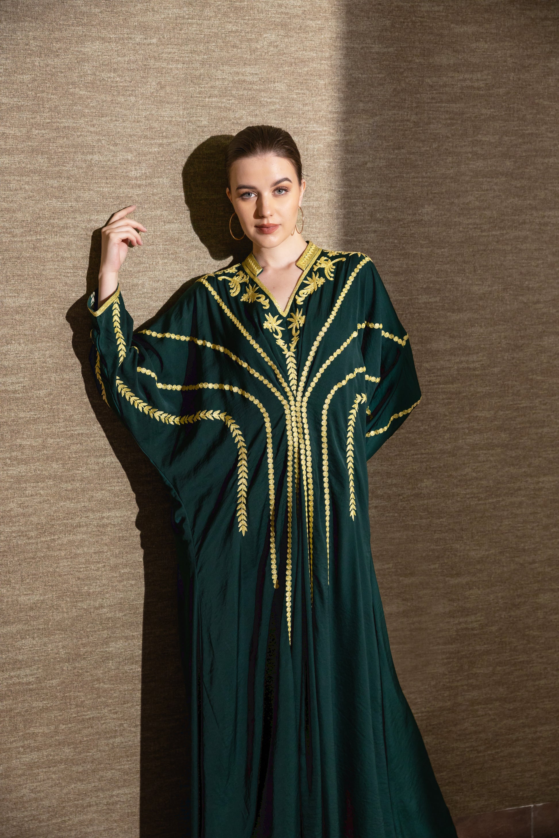 يتميز هذا الفستان الأنيق بسحر خالد مع تطريزه الرائع بخيوط ذهبية في التطريز العربي التقليدي والأكمام الفضفاضة العصرية. تباهى بها في التجمعات والمناسبات الخاصة!