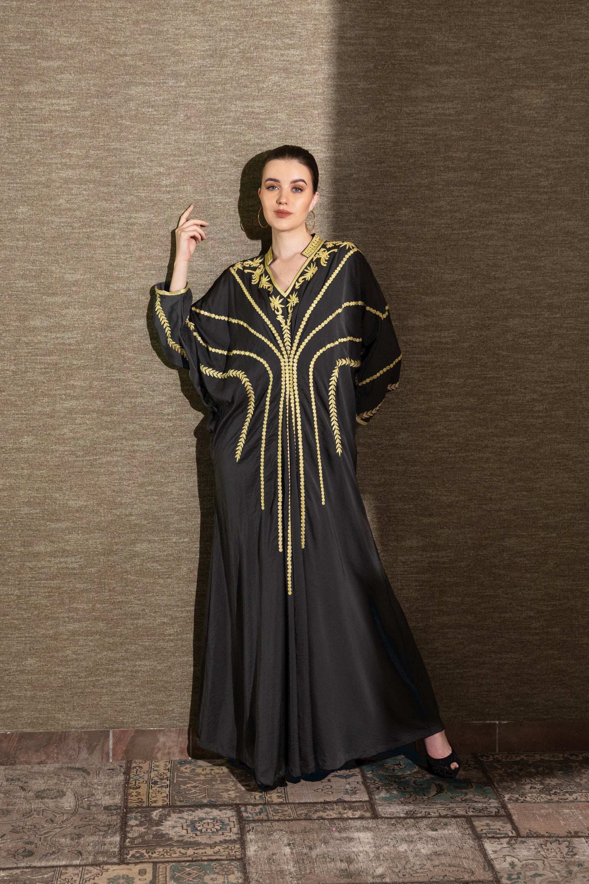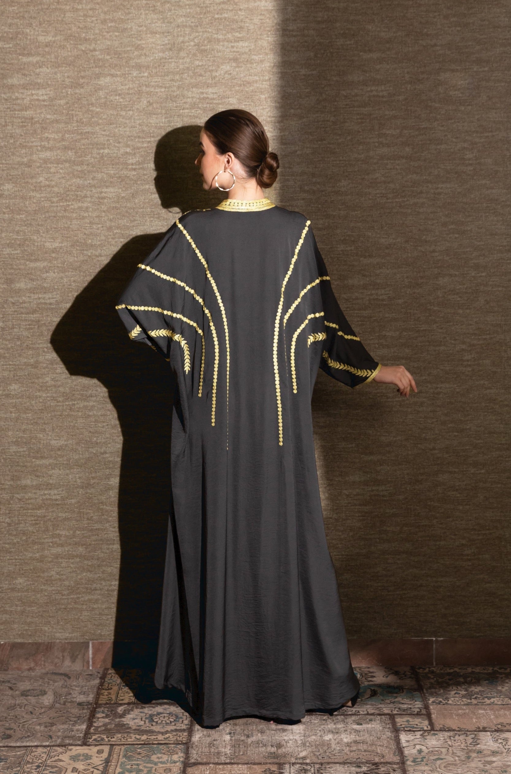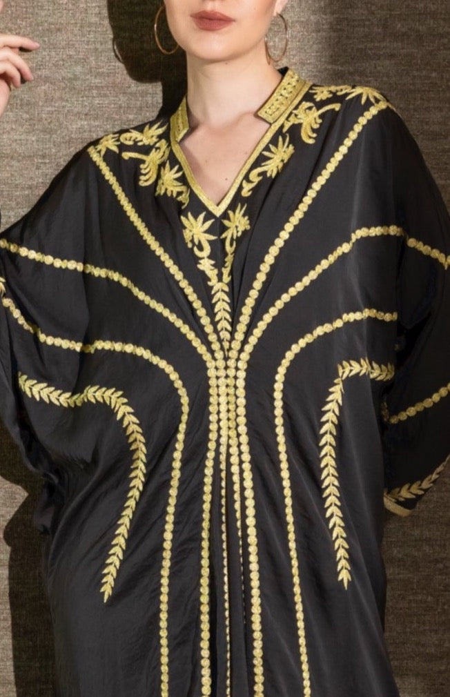 يتميز هذا الفستان الأنيق بسحر خالد مع تطريزه الرائع بخيوط ذهبية في التطريز العربي التقليدي والأكمام الفضفاضة العصرية. تباهى بها في التجمعات والمناسبات الخاصة!