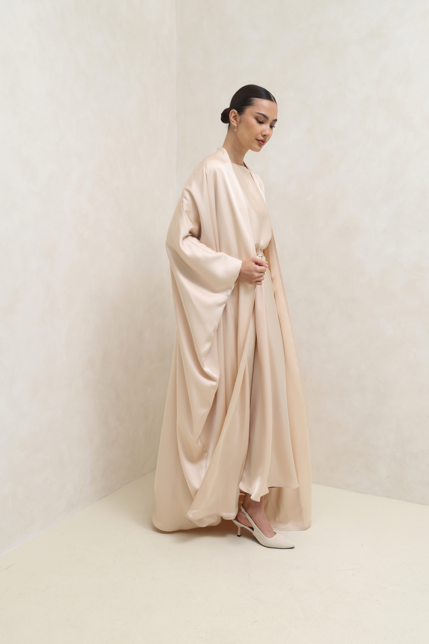 عباية عاجية مفتوحة من الأمام، بقصة انسيابية ناعمة وأكمام واسعة، مزينة بتفاصيل دقيقة تضفي عليها أناقة راقية. قطعة أنيقة ومتعددة الاستخدامات، مثالية للمناسبات الخاصة والسهرات.