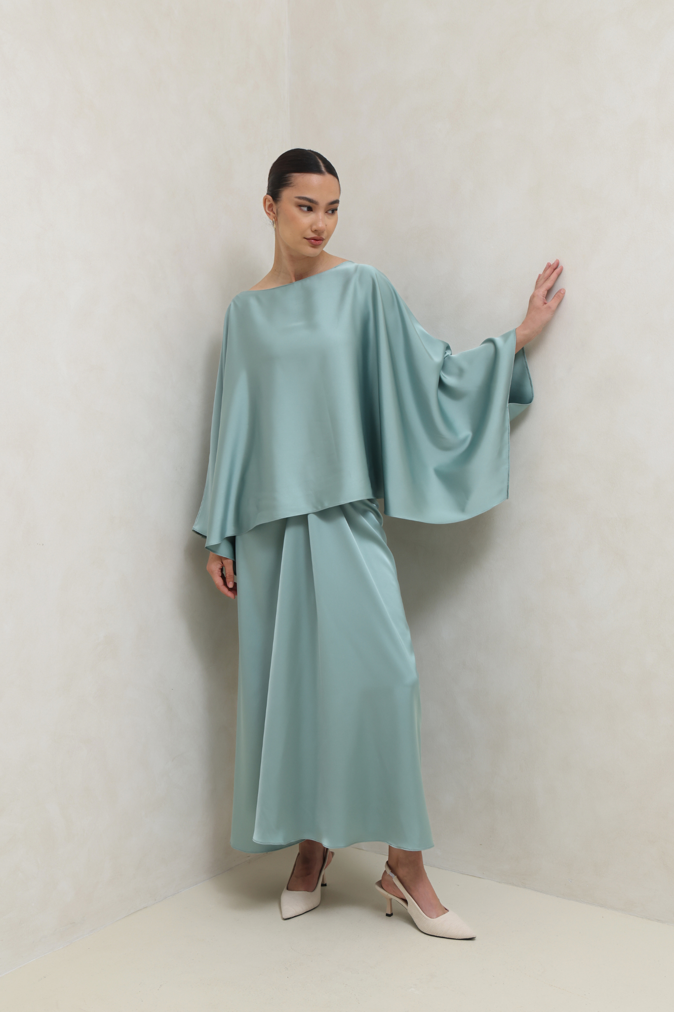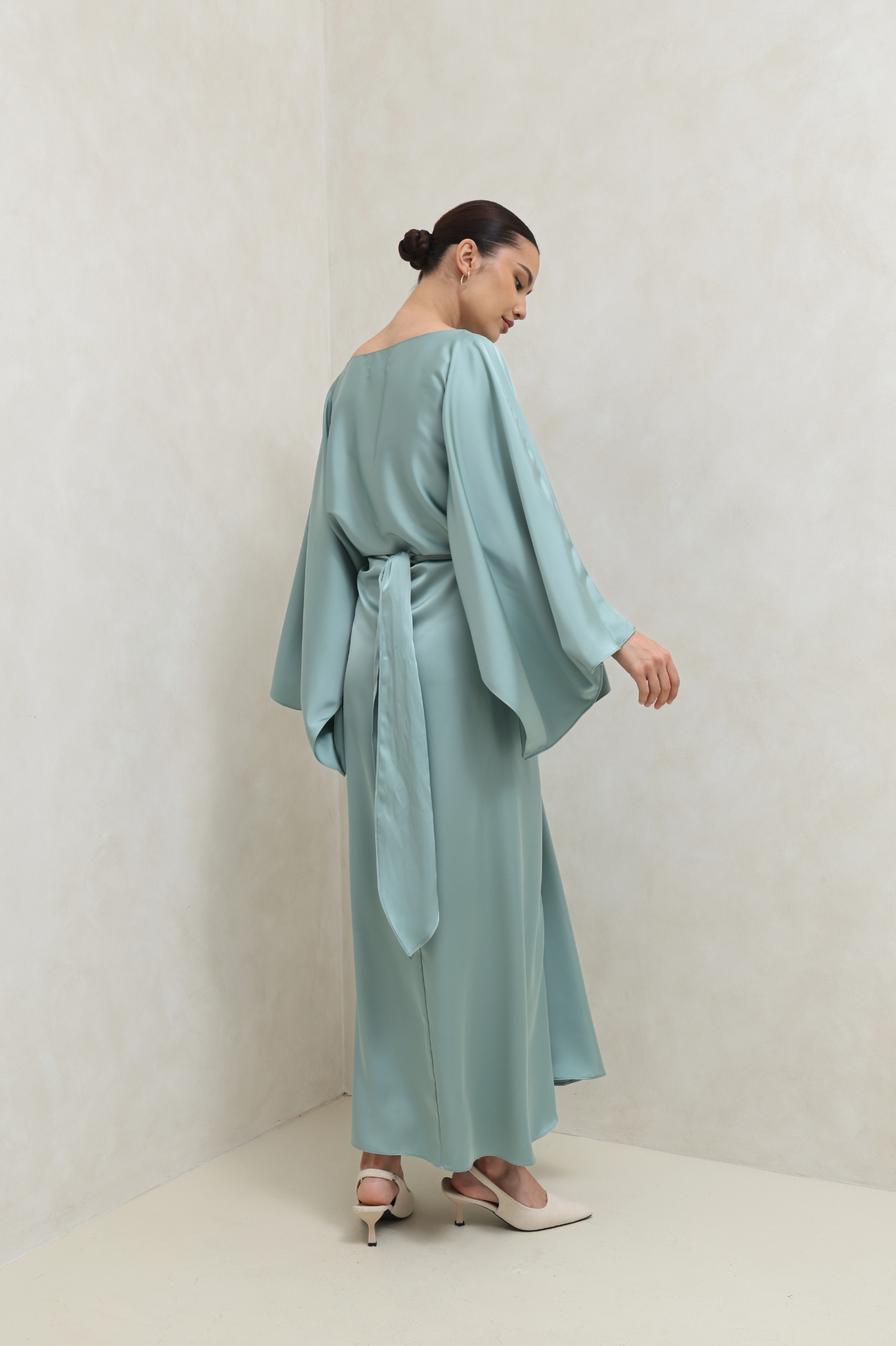 فستان أخضر بتصميم ملتف وأكمام كيب انسيابية