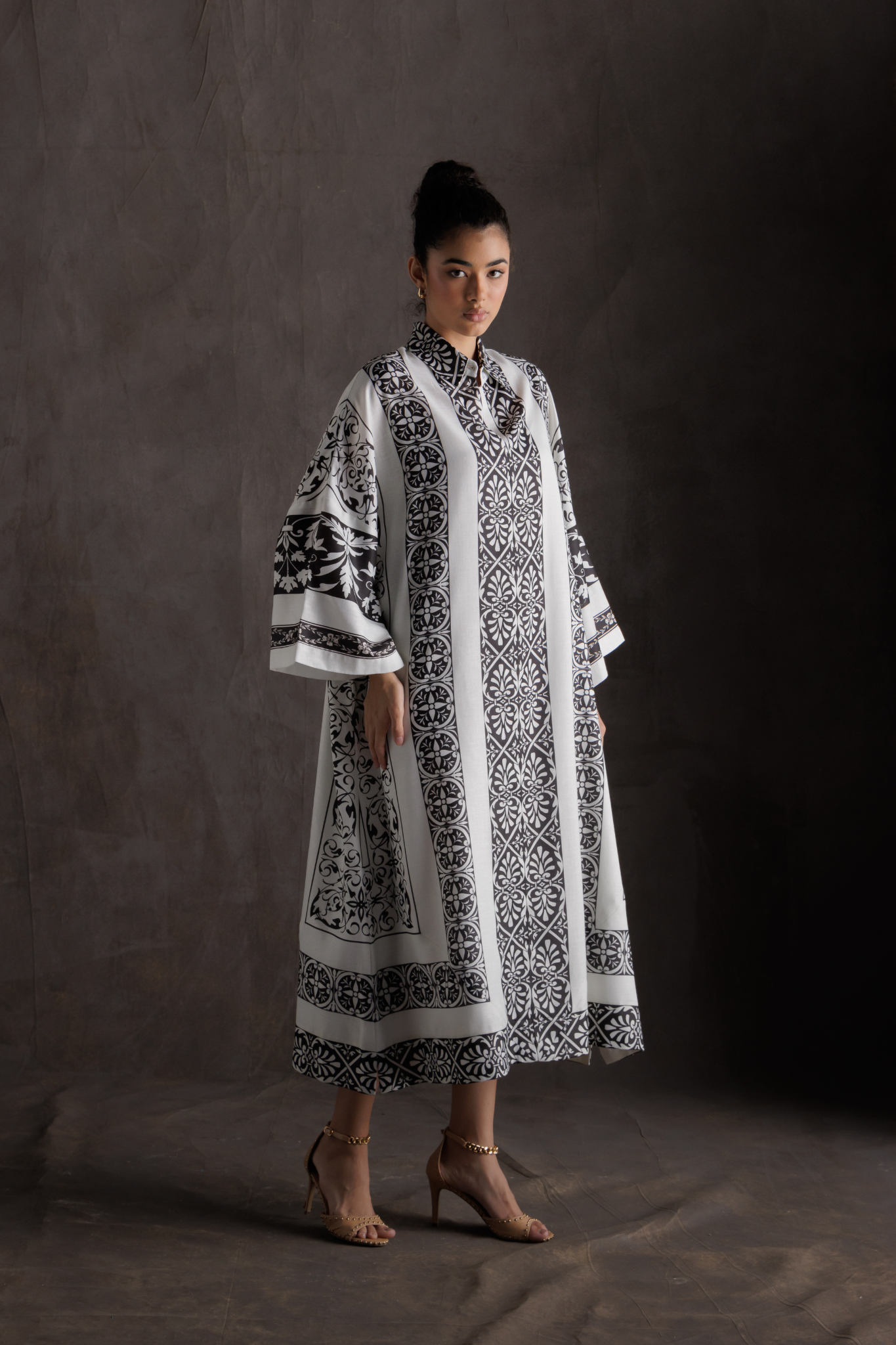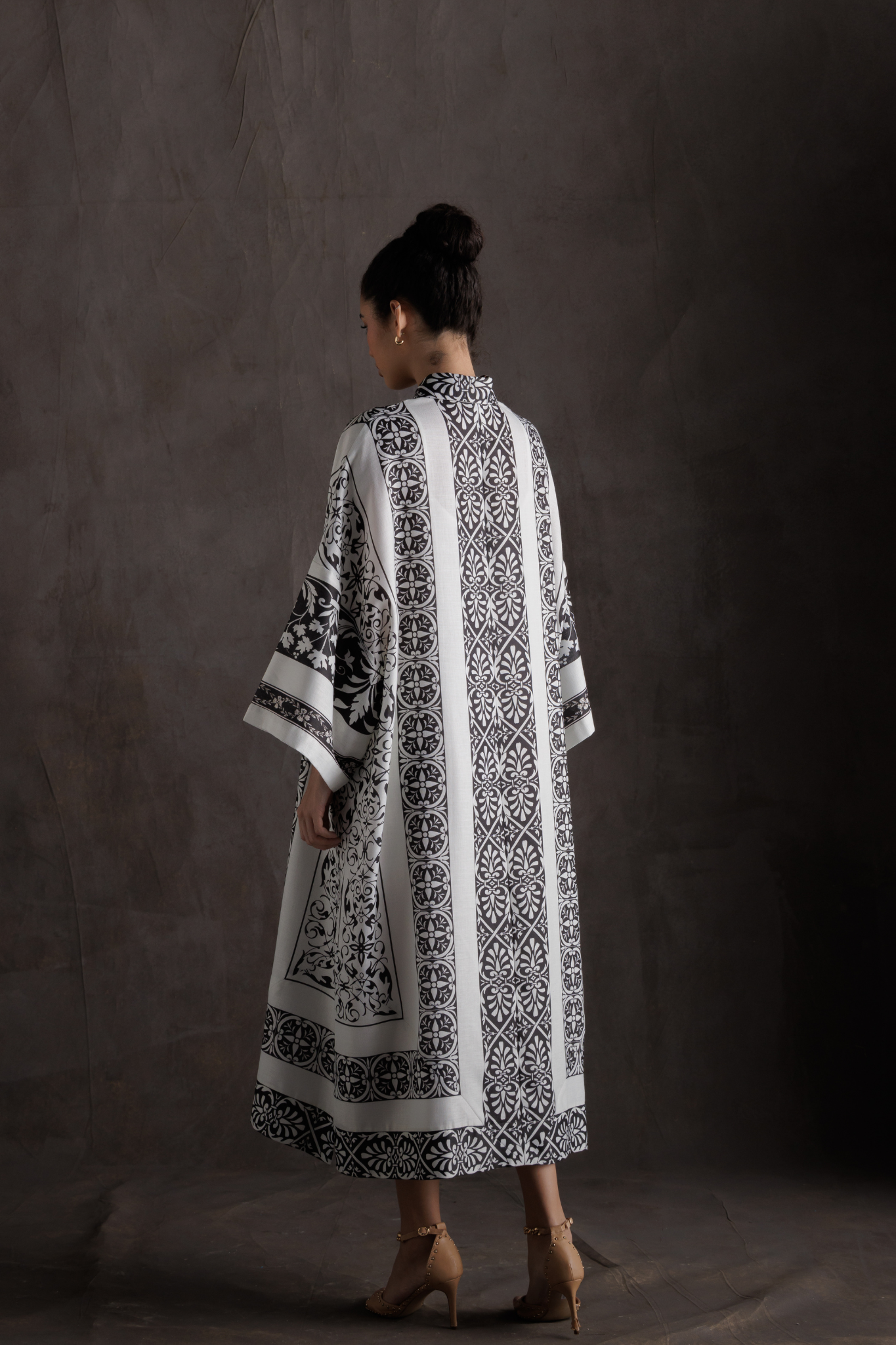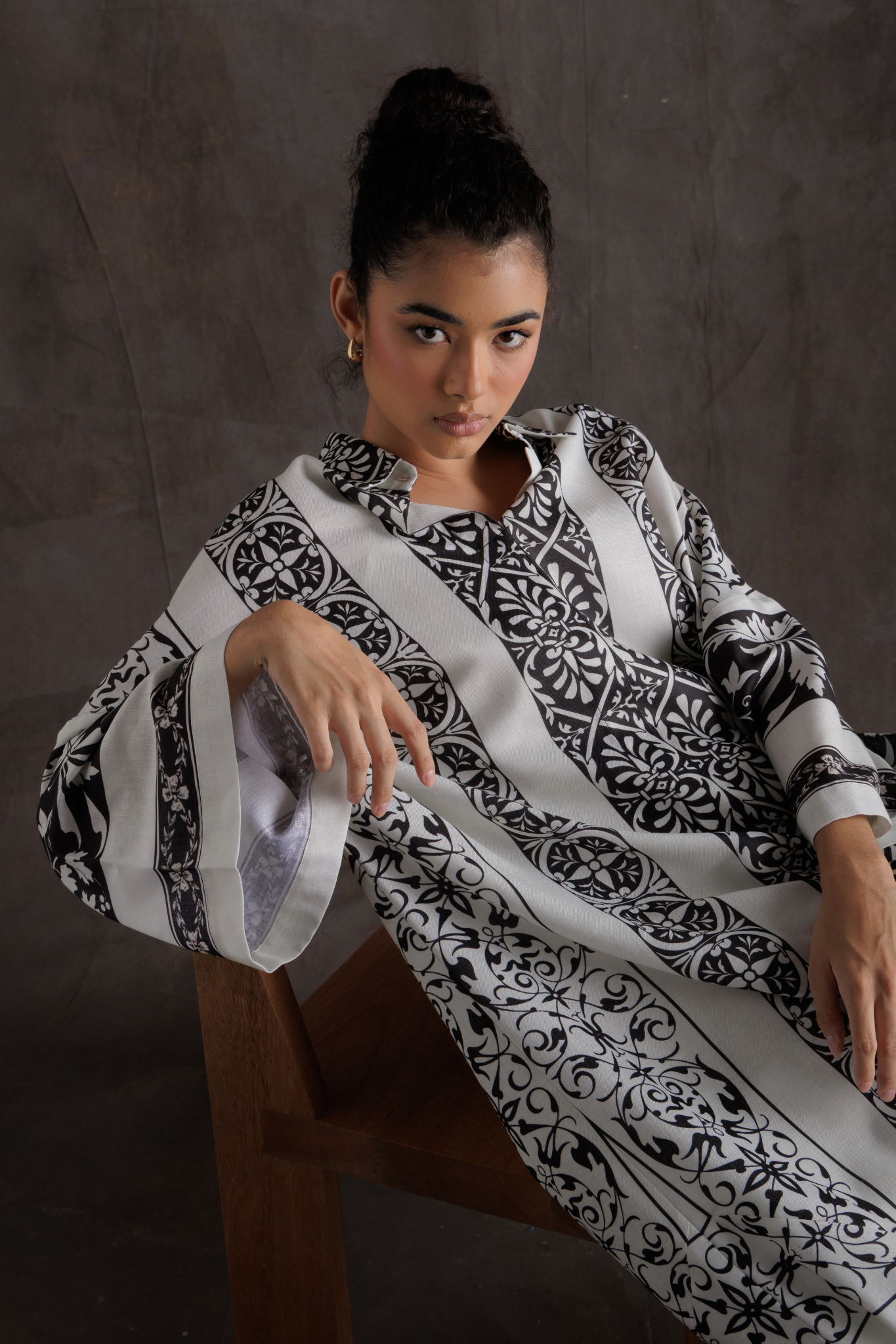هذا القفطان الأسود والأبيض يُبرز نقوشًا زهرية هندسية على قماش خفيف الوزن، ليمنحكِ إطلالةً مريحةً وأنيقةً. أكمامه الواسعة وقصته المستقيمة تضمنان سهولة الارتداء، بينما يُضفي خط العنق لمسةً من الأناقة. مثالي للمناسبات غير الرسمية.