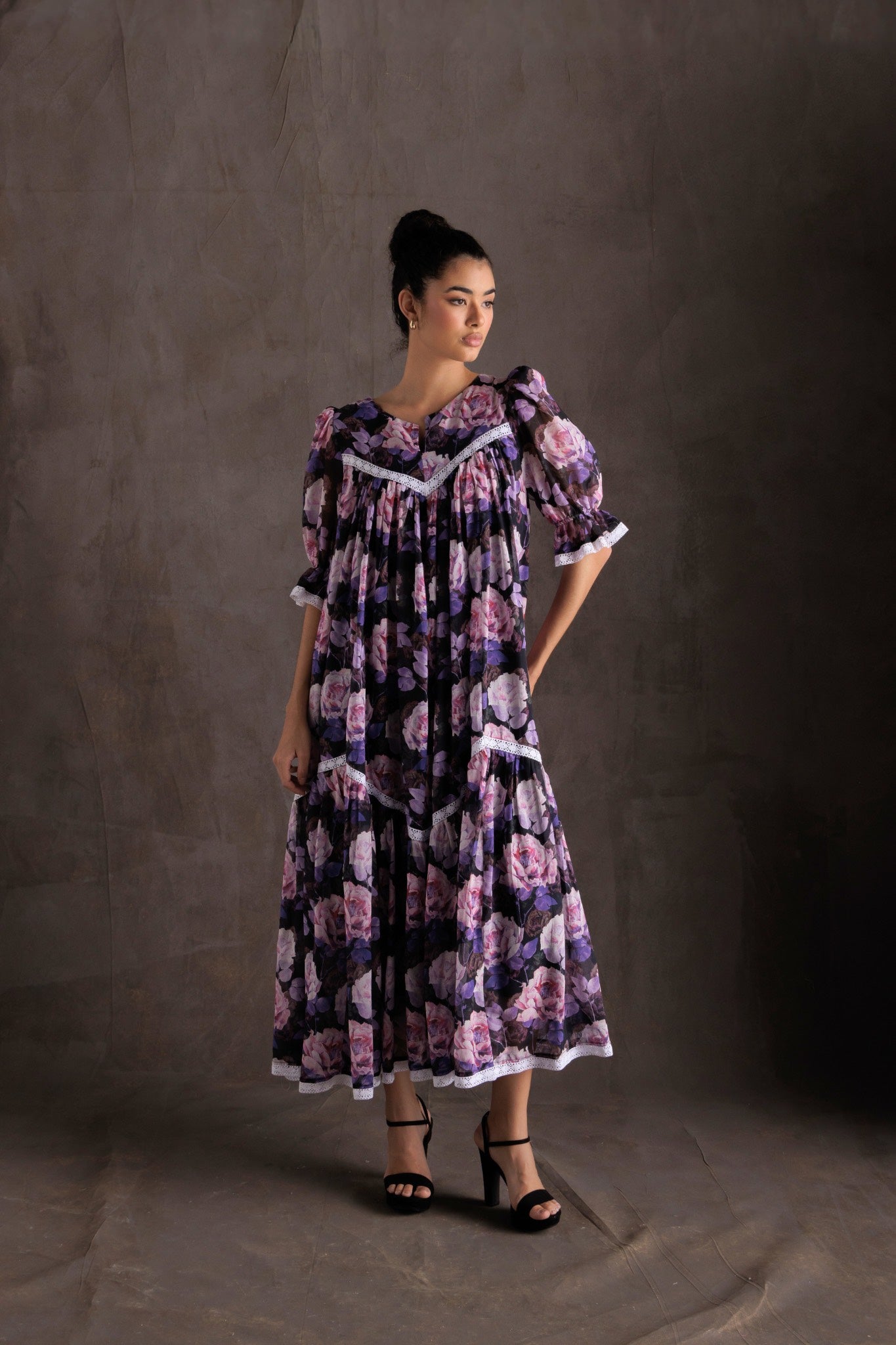 يتميز هذه الفستان الأنيق والأنثوي بتفاصيل دانتيل رقيقة على الصدر، ومظهر انسيابي رائع، وأكمام منتفخة ساحرة. مثالي لأي مناسبة، سيجعلك تشعرين بالثقة والجمال.