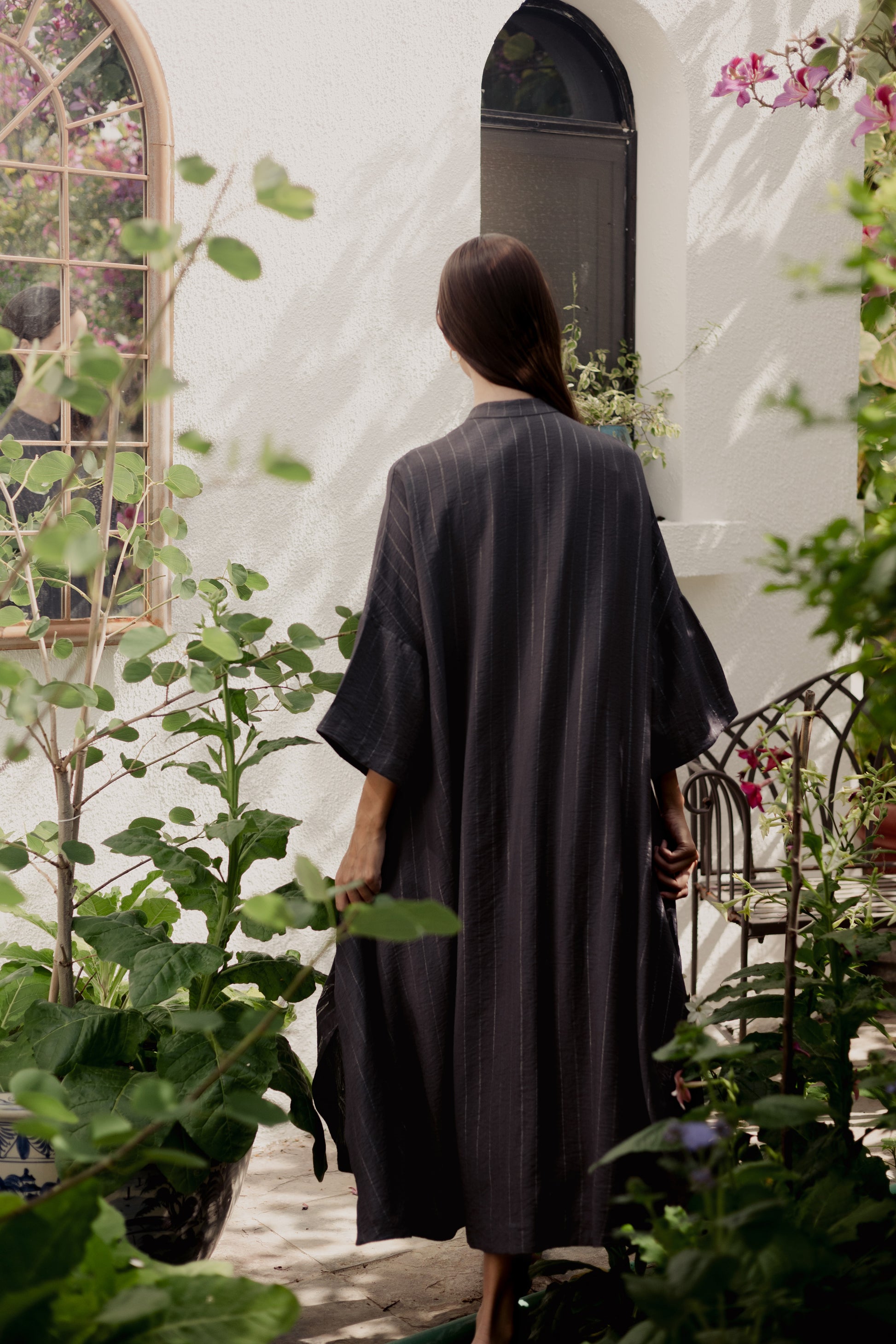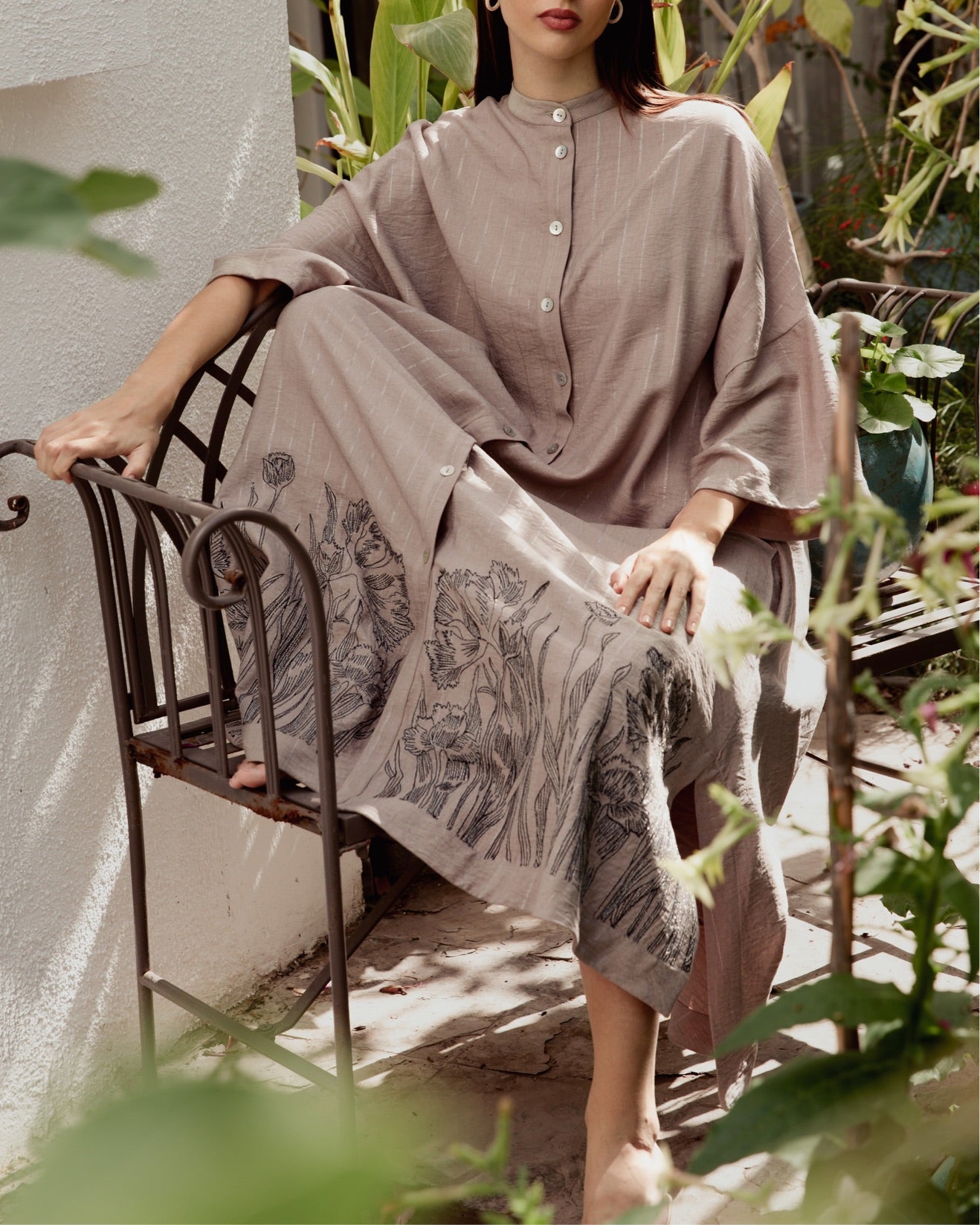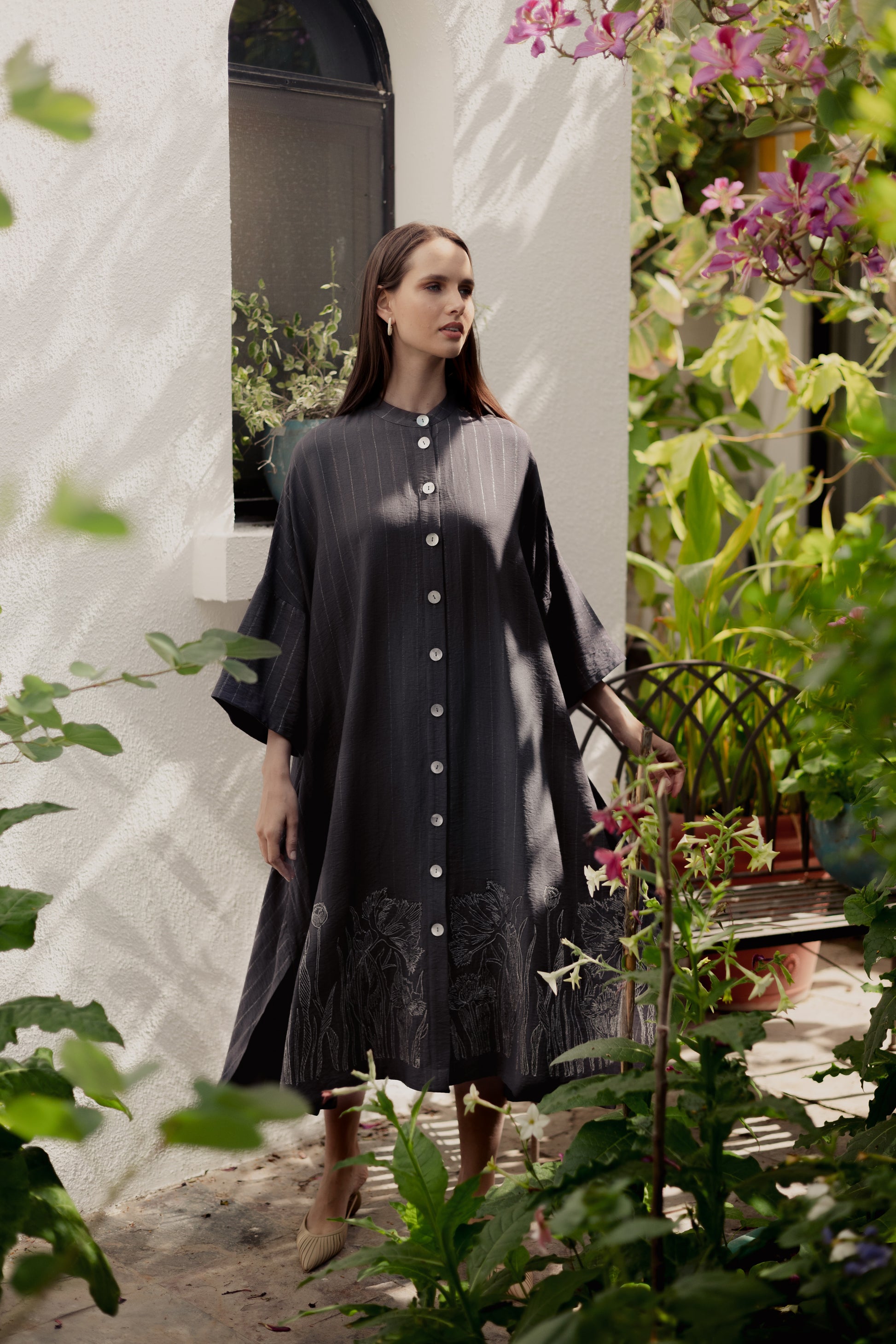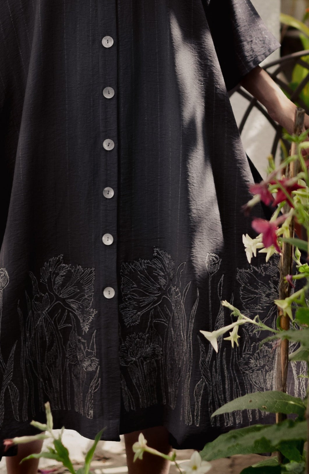 فستان قميص متوسط الطول بأكمام طويلة مع أطراف مطرزة بخيوط زهرية