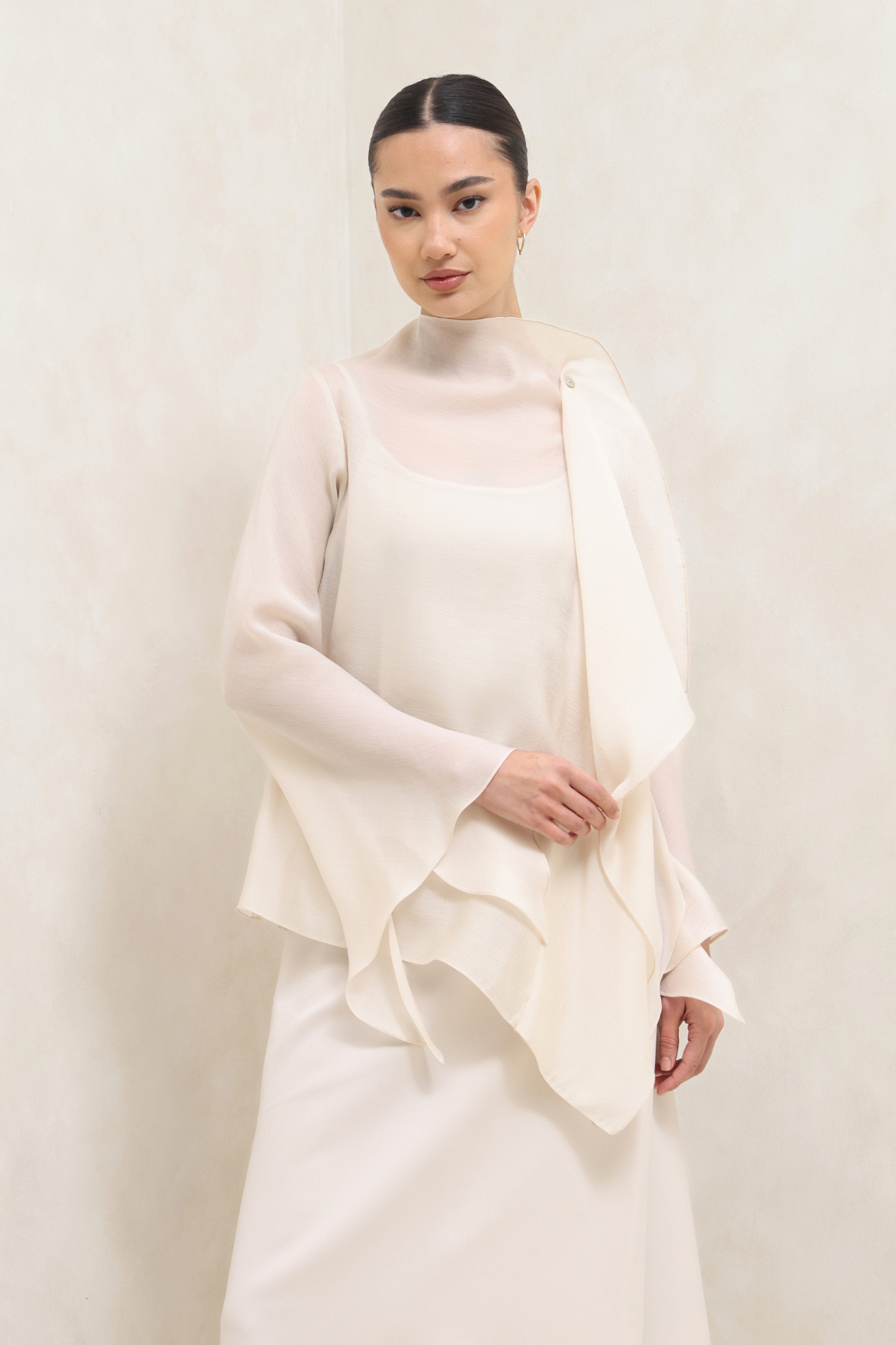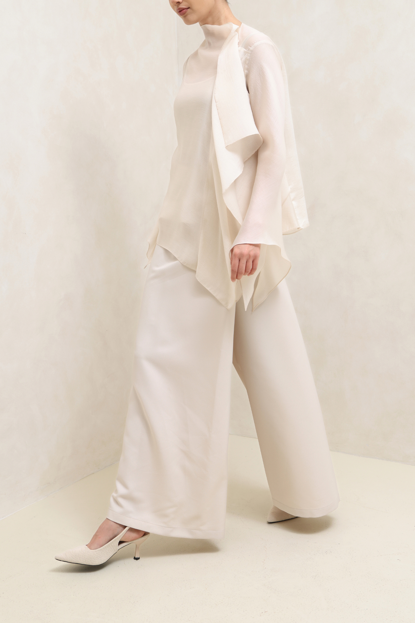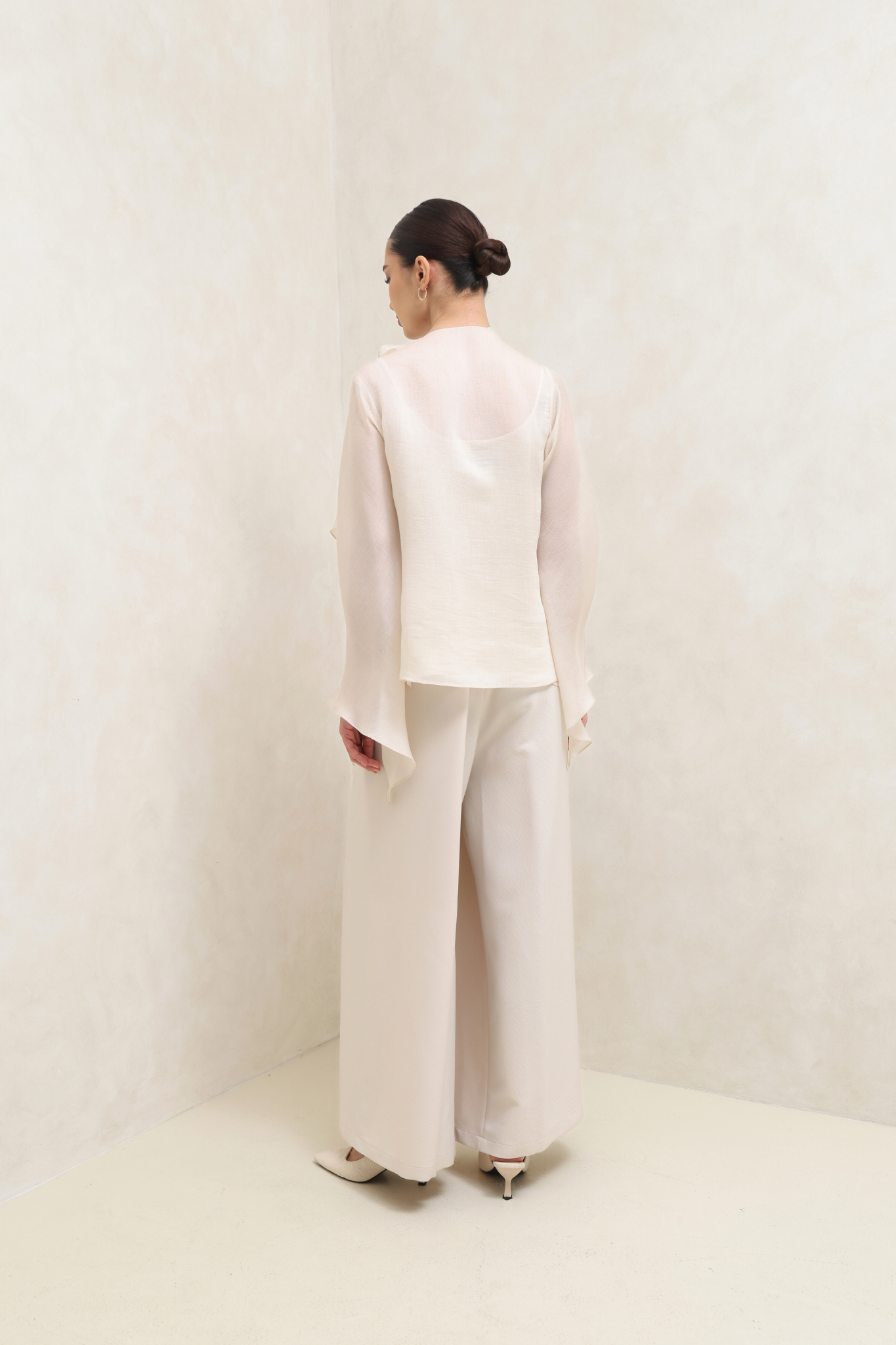طقم بيج ناعم يتألف من قميص فضفاض بأكمام واسعة تمنح حركة رشيقة، مع بنطال واسع الساقين بقصة مستقيمة لإطلالة أنيقة ومريحة في آن واحد. إطلالة عصرية وأنثوية مثالية للمناسبات الخاصة والأمسيات الراقية.