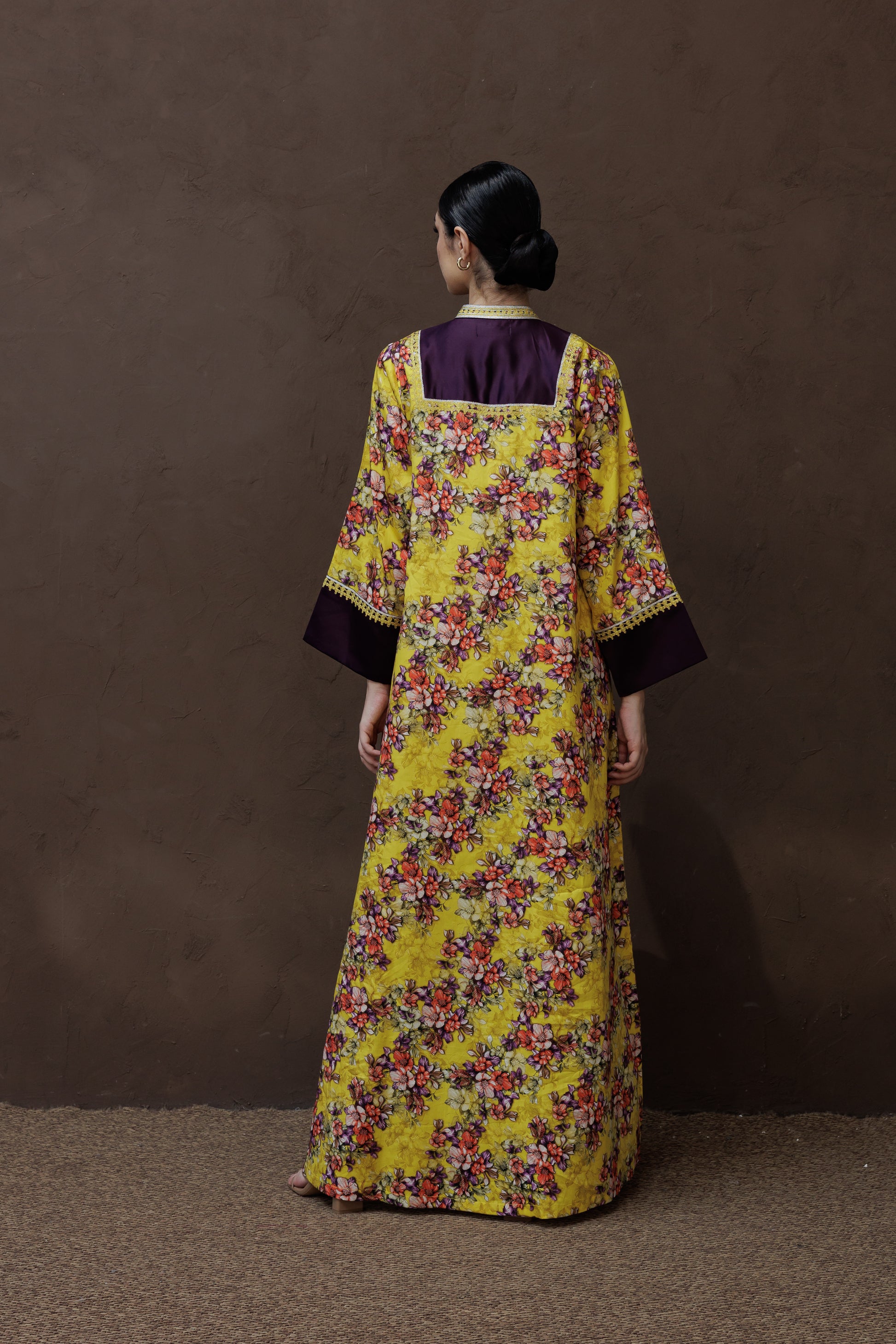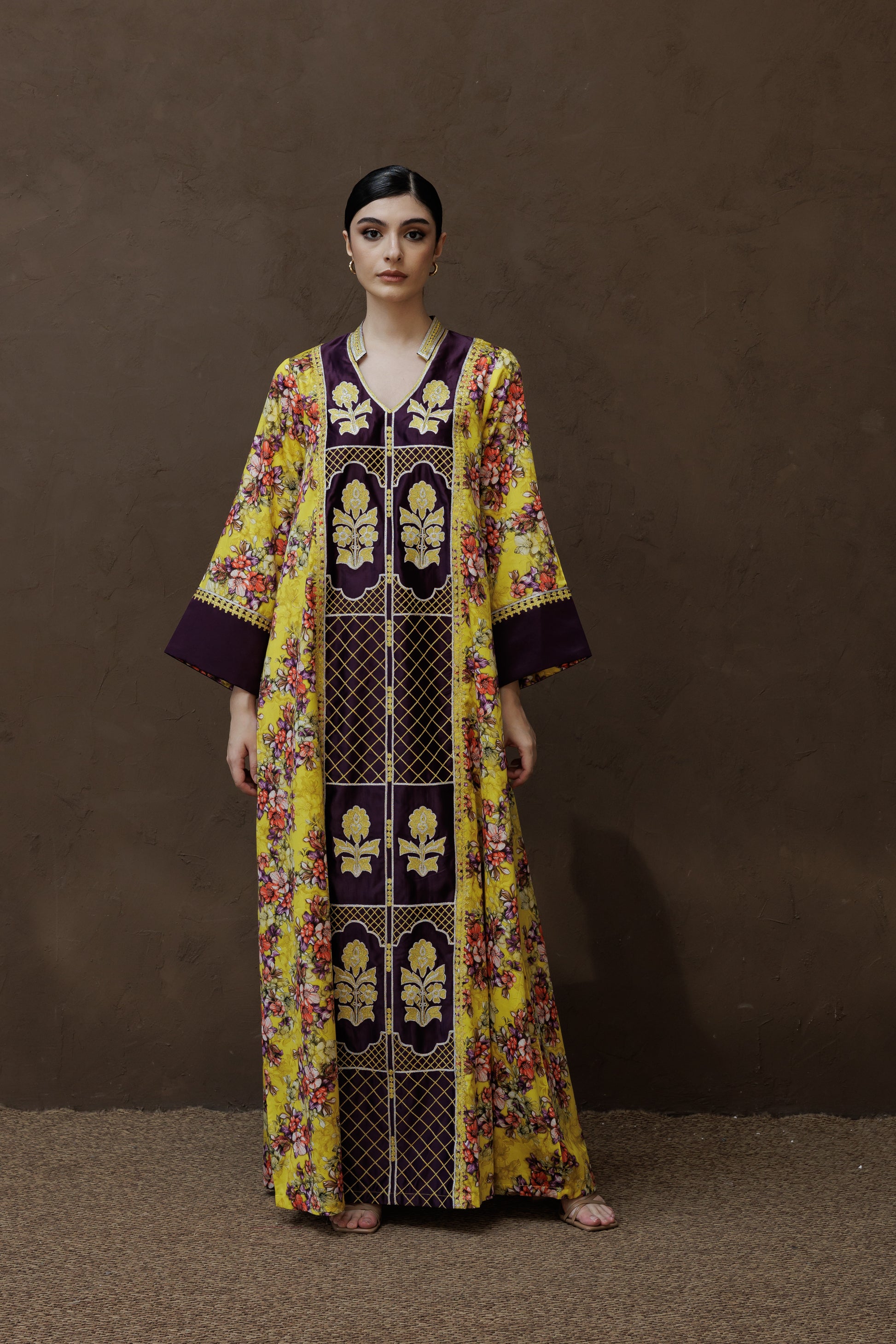 استمتعي بالأناقة مع هذه الجلابية التي تتميز بتطريز معقد مع حافة ساتان مفصلة لرفع مستوى مظهرك