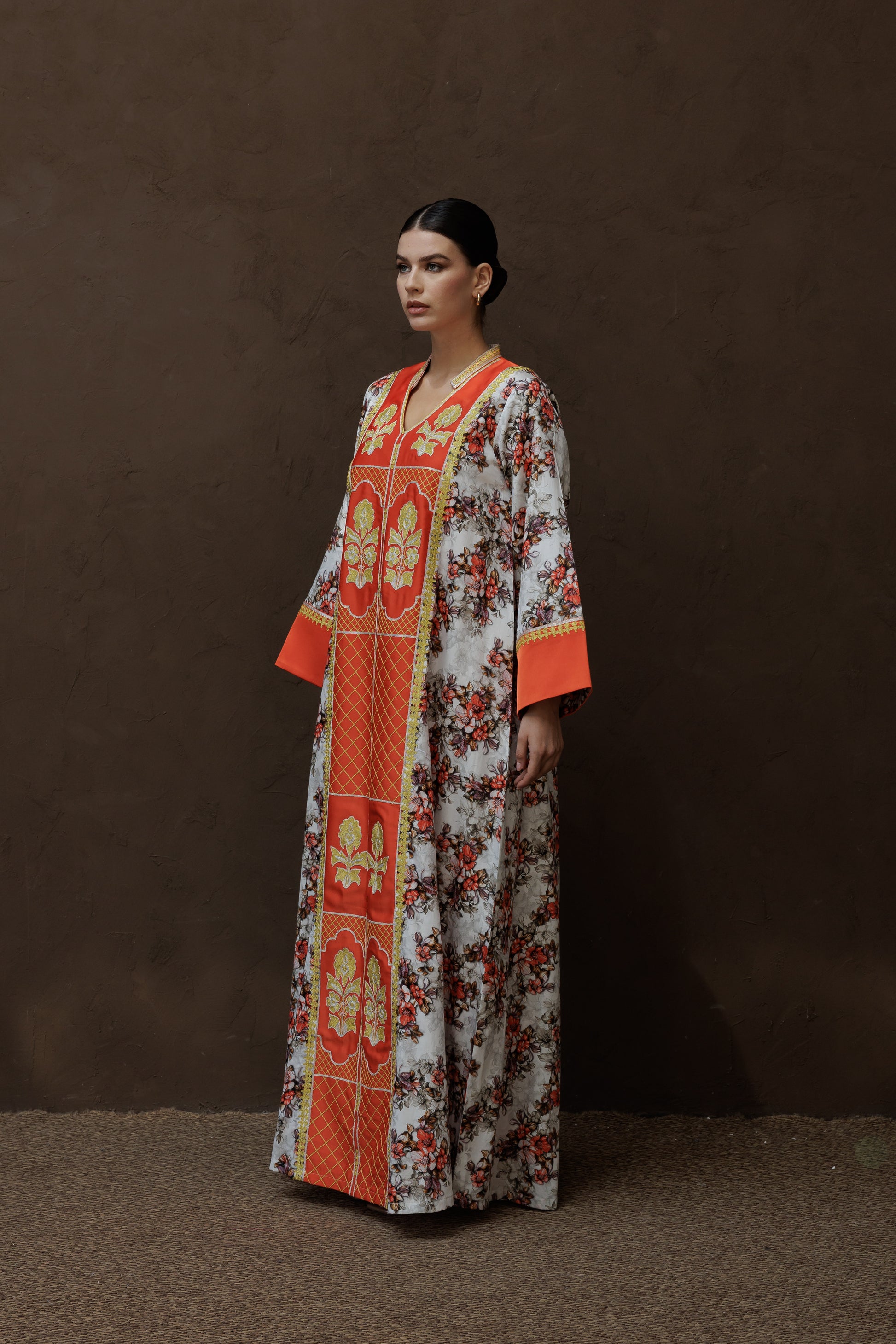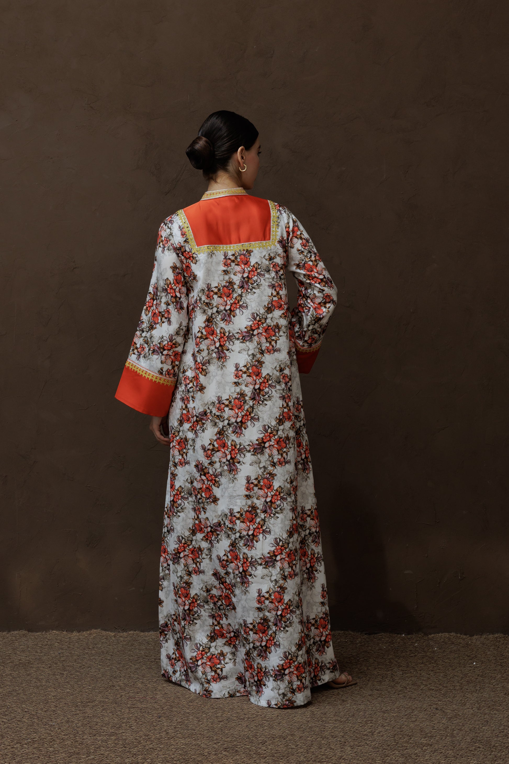 استمتعي بالأناقة مع هذه الجلابية التي تتميز بتطريز معقد مع حافة ساتان مفصلة لرفع مستوى مظهرك