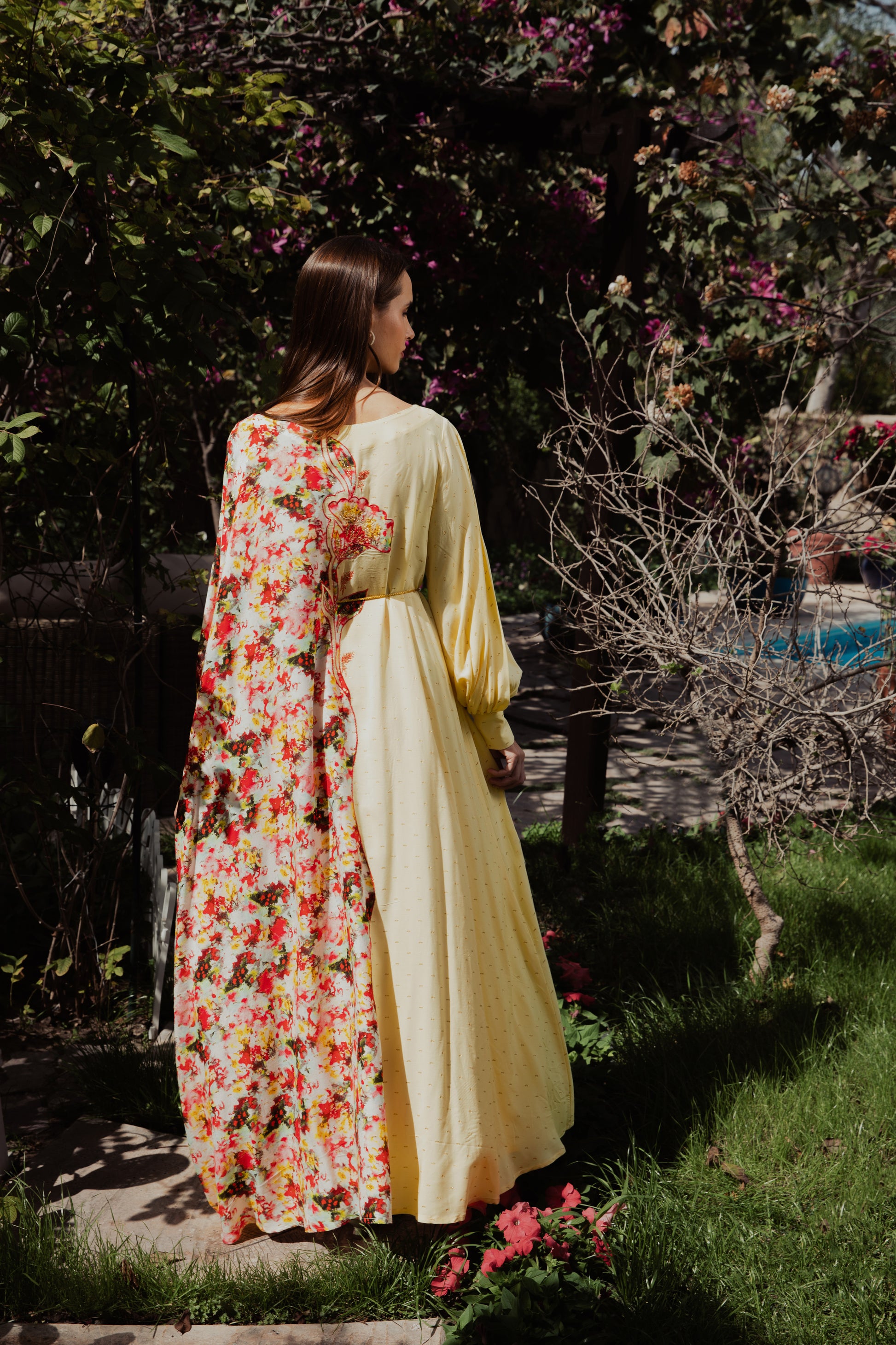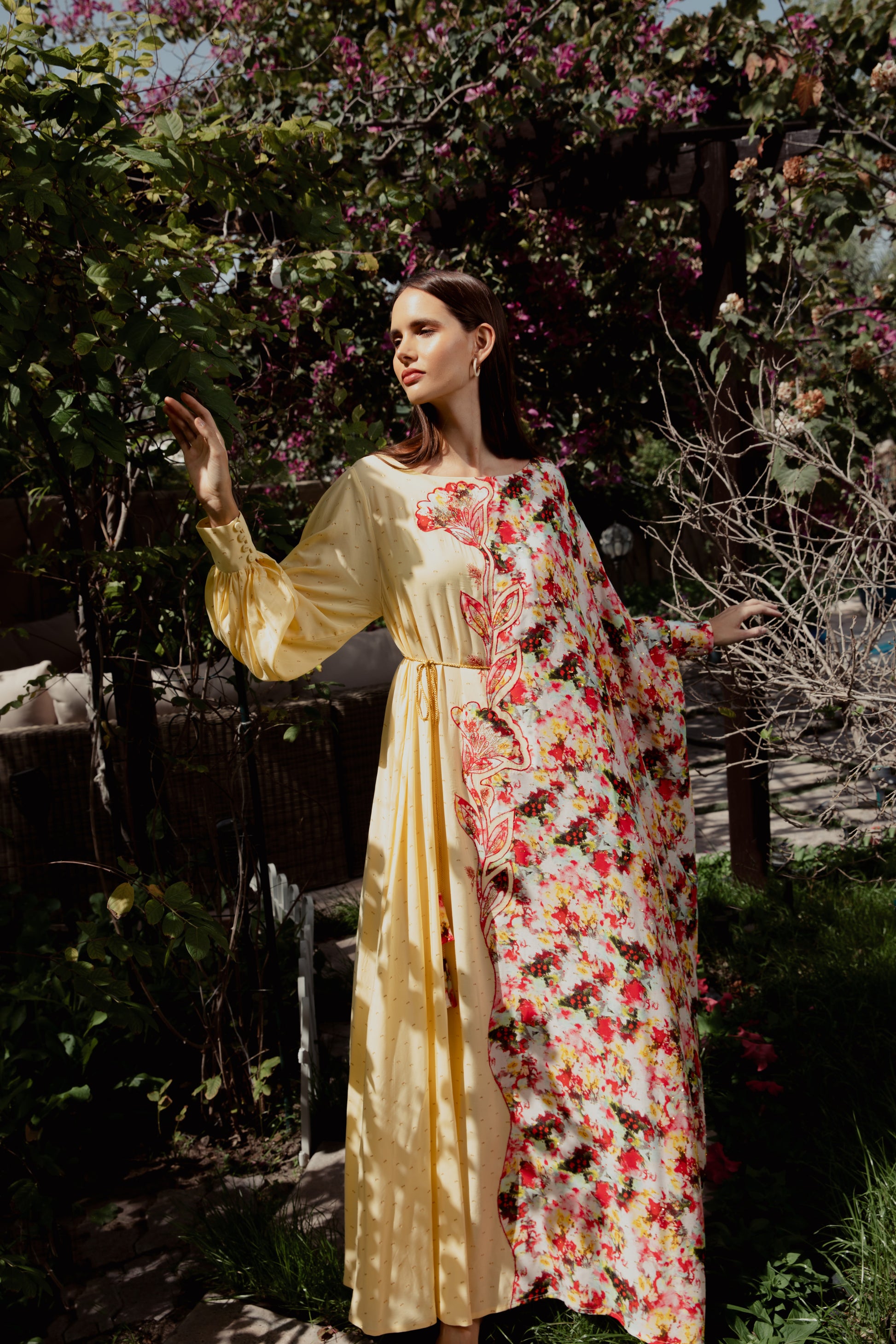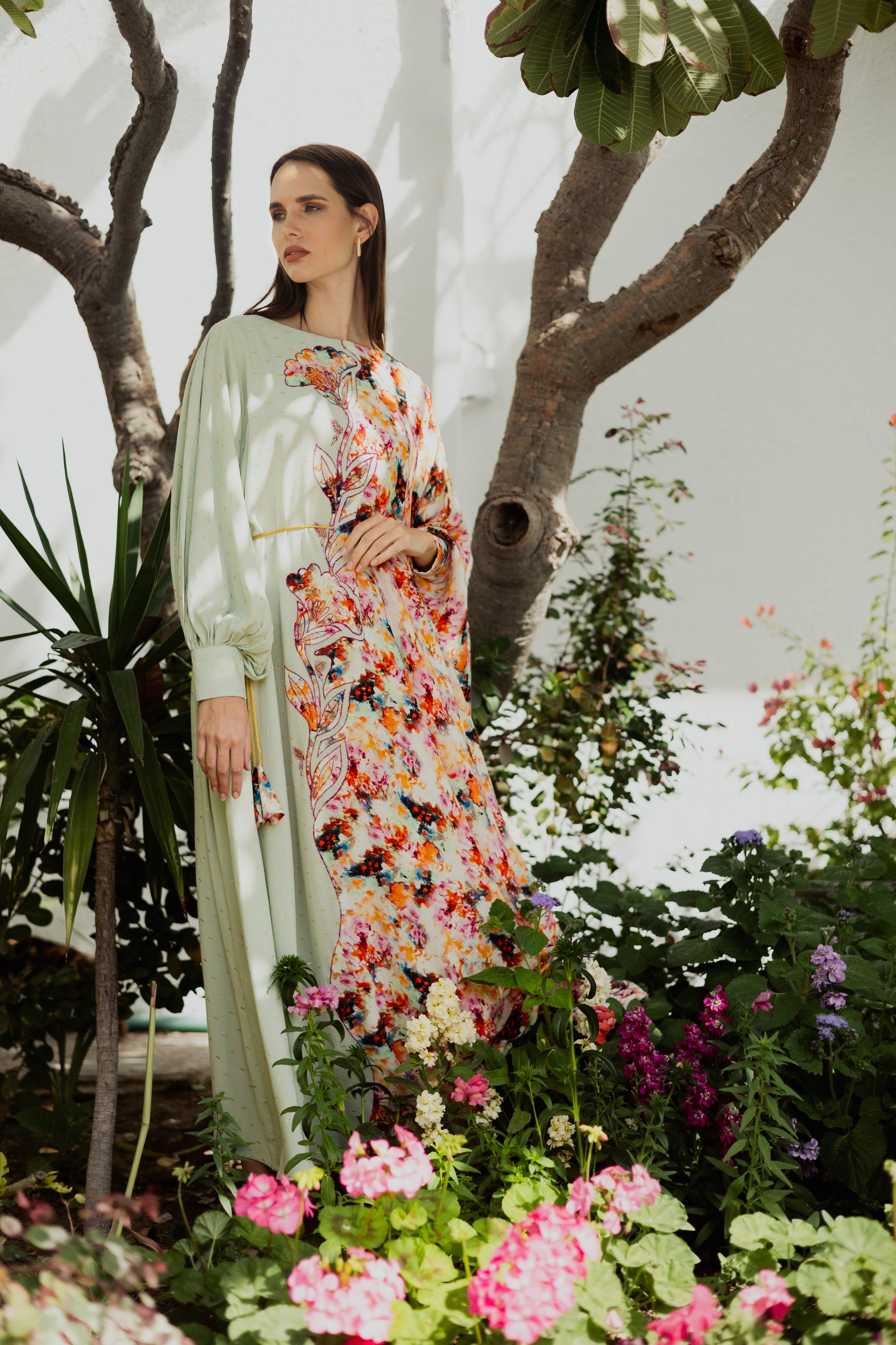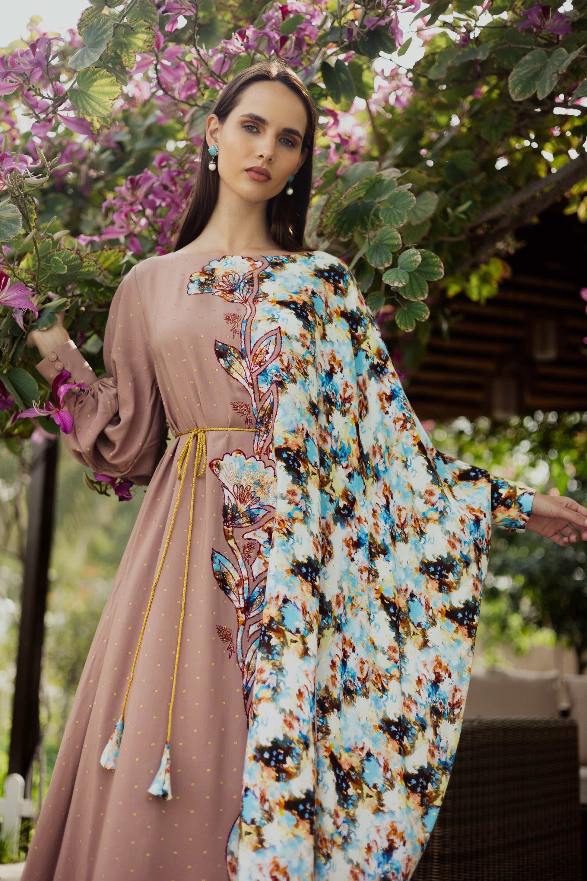 فستان بحزام بأكمام أسقفية وطبعة زهور وتطريز نقدي تقليدي