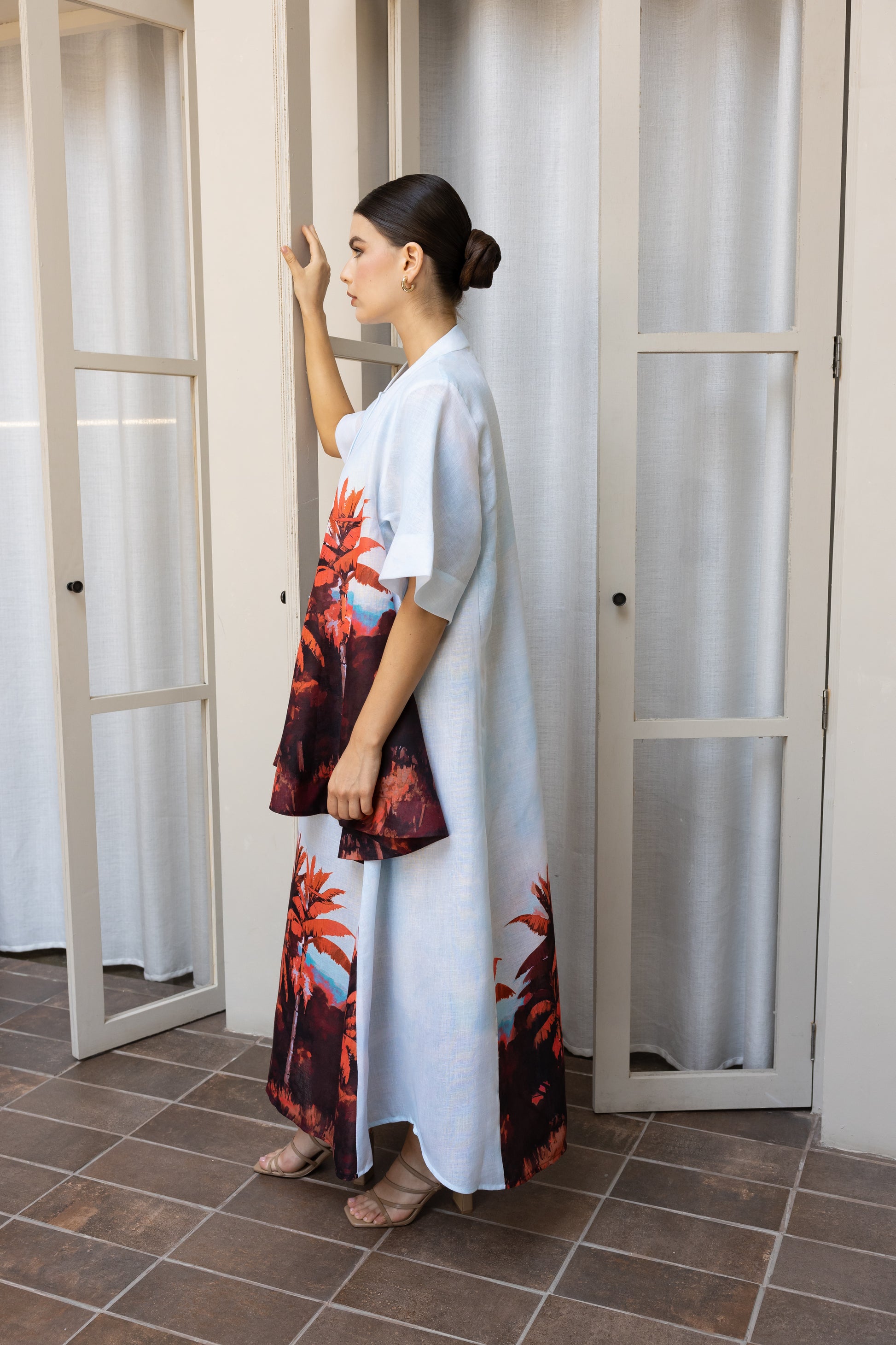 قم بترقية أسلوبك في الموضة مع هذا القميص الكتاني، الذي يتميز بنمط شجرة الموز الرقيقة وأكمام قصيرة للحصول على مظهر أنيق وغير رسمي.