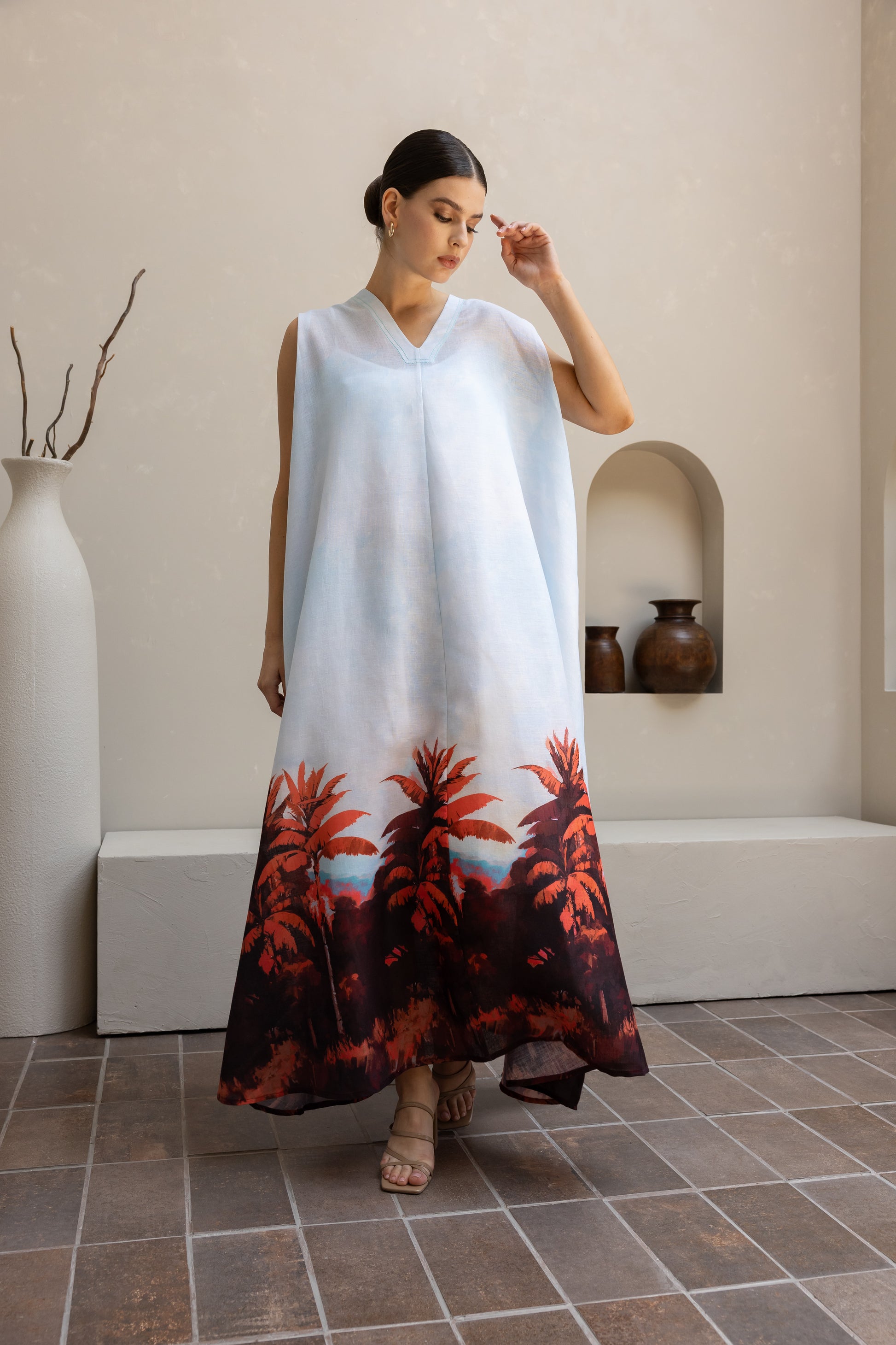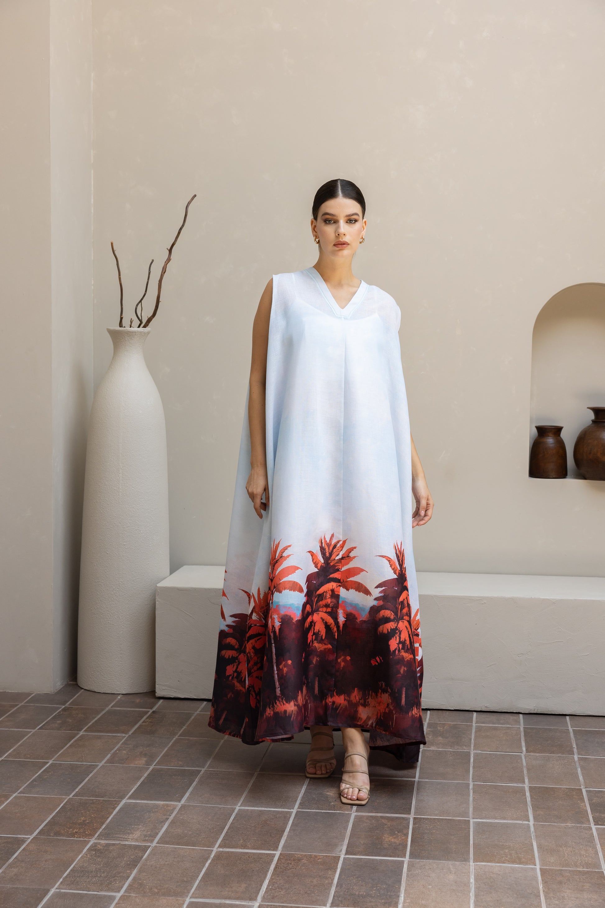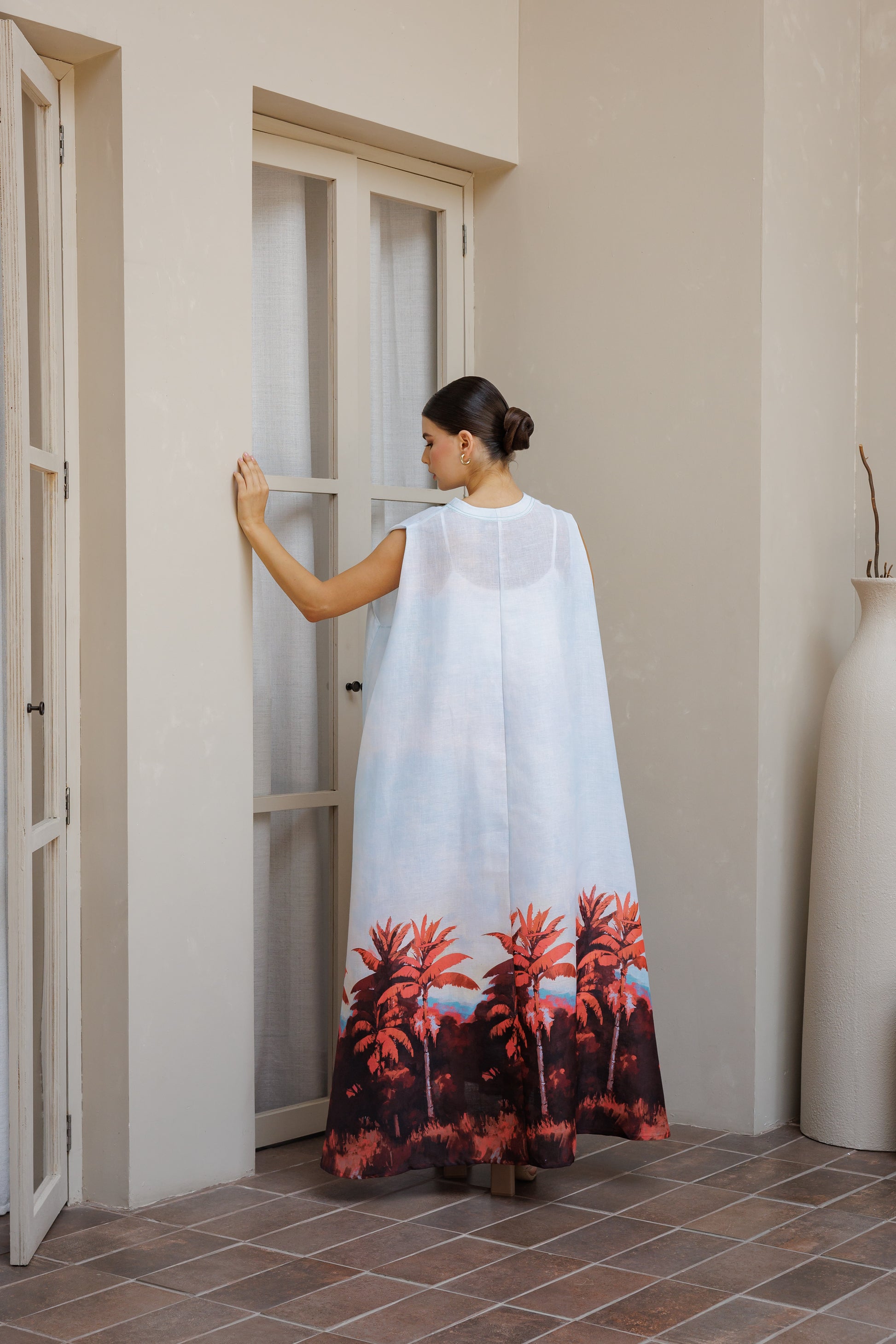 قم بترقية أسلوبك في الموضة مع هذا القميص الكتاني، الذي يتميز بنمط شجرة الموز الرقيقة وفستان بلا أكمام لإطلالة أنيقة ومختصرة.