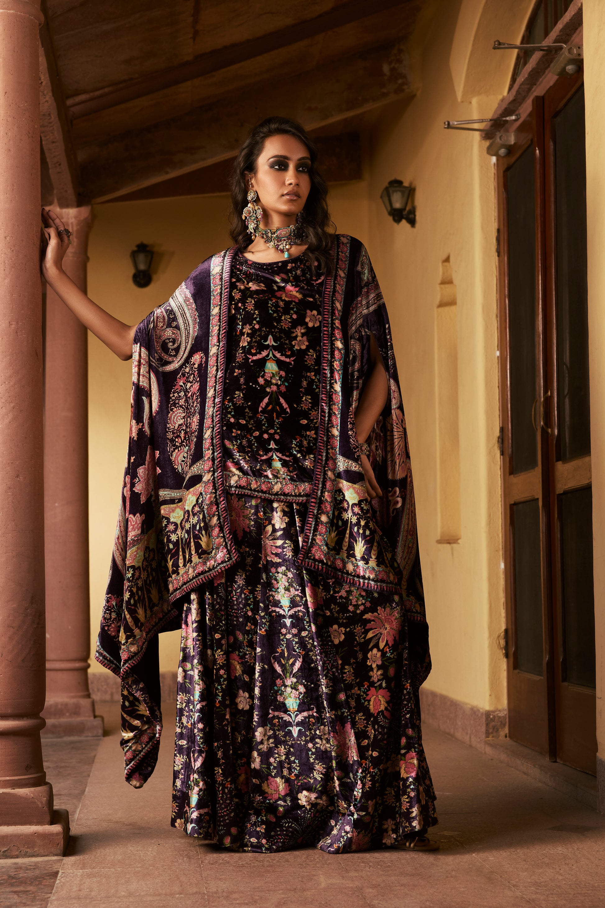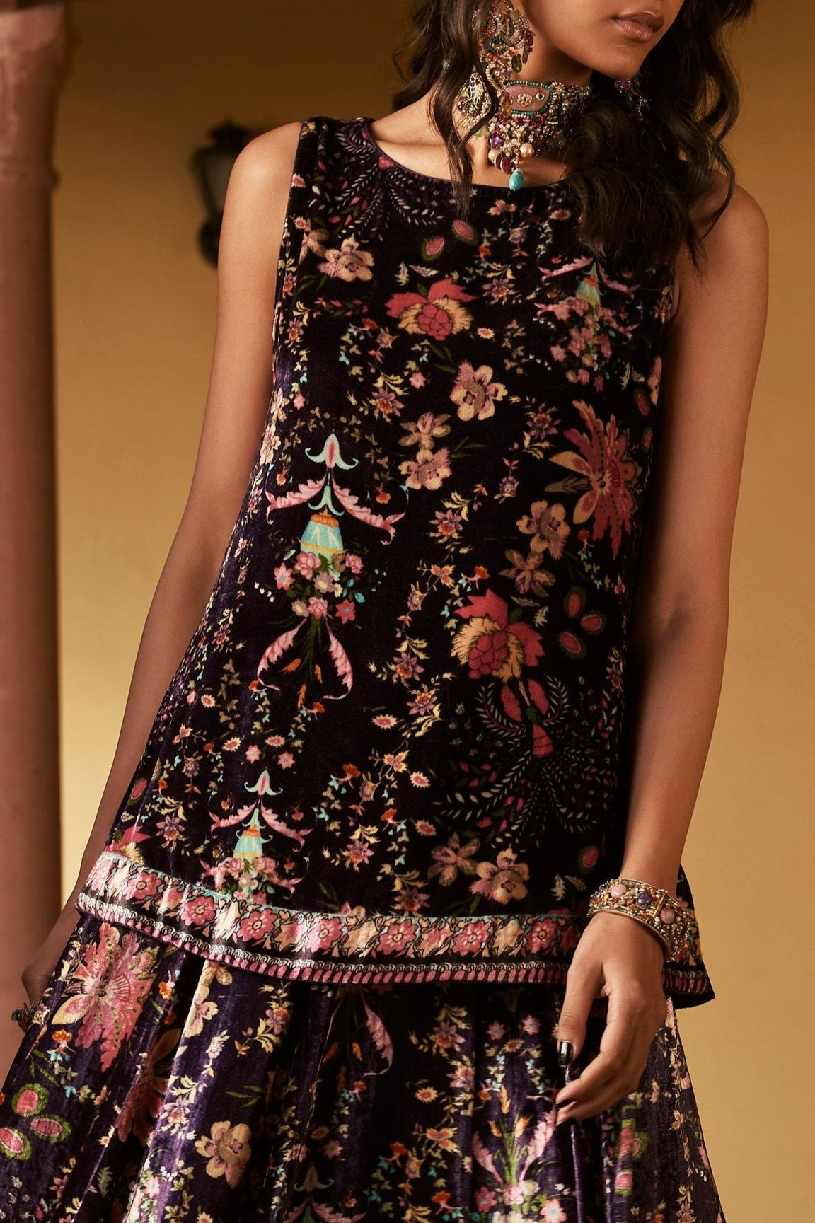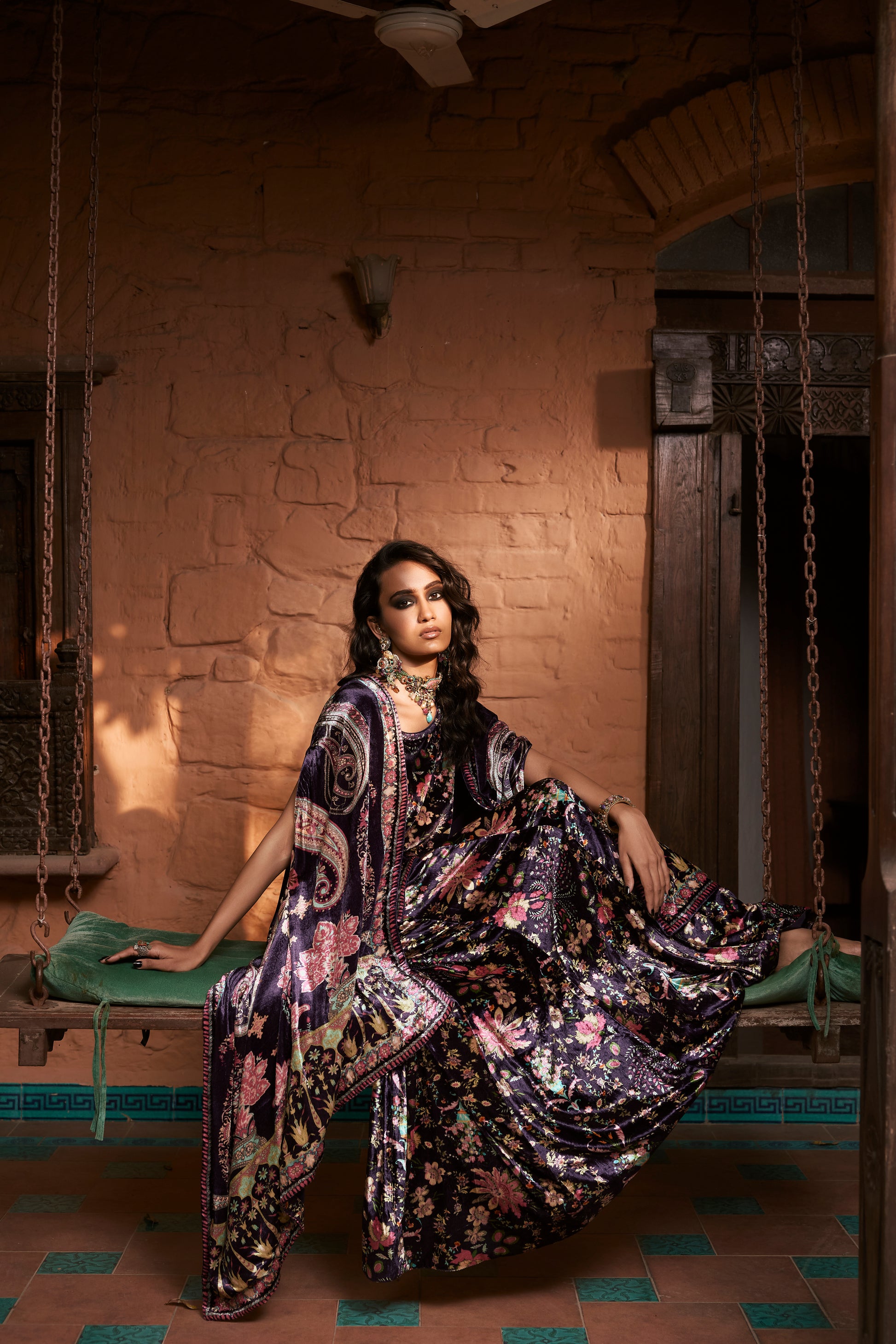 يتميز بقماش مخملي أسود فاخر، يتضمن هذا الطقم فستانًا مخمليًا مزخرفًا بالأزهار مع حزام مخملي مزخرف.