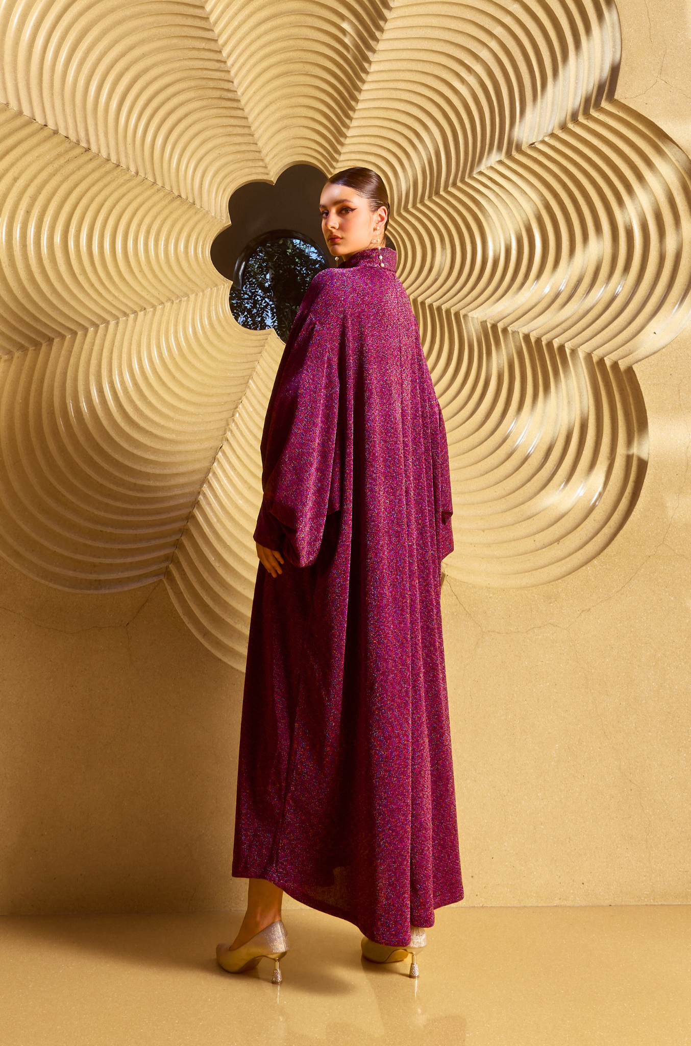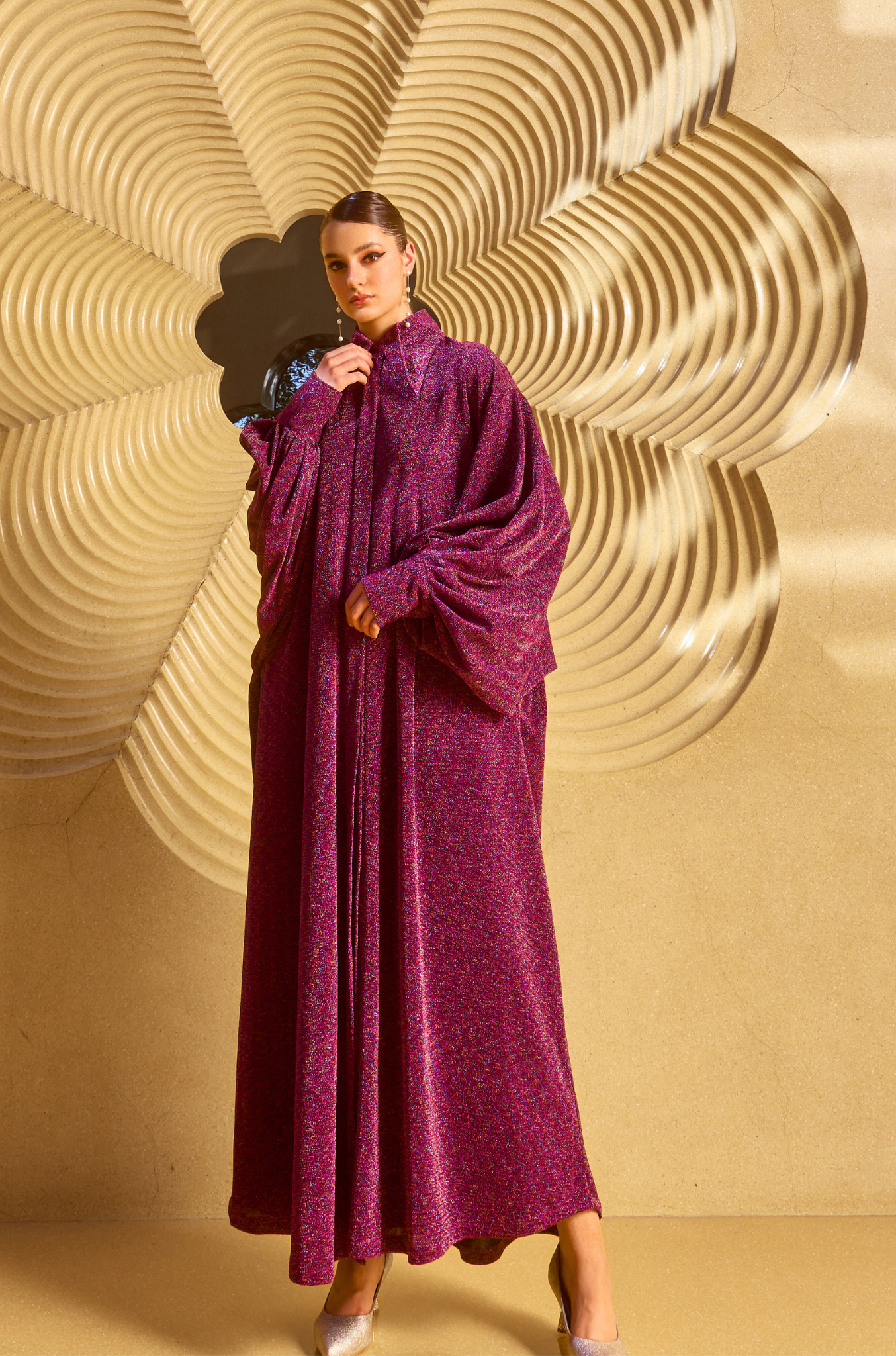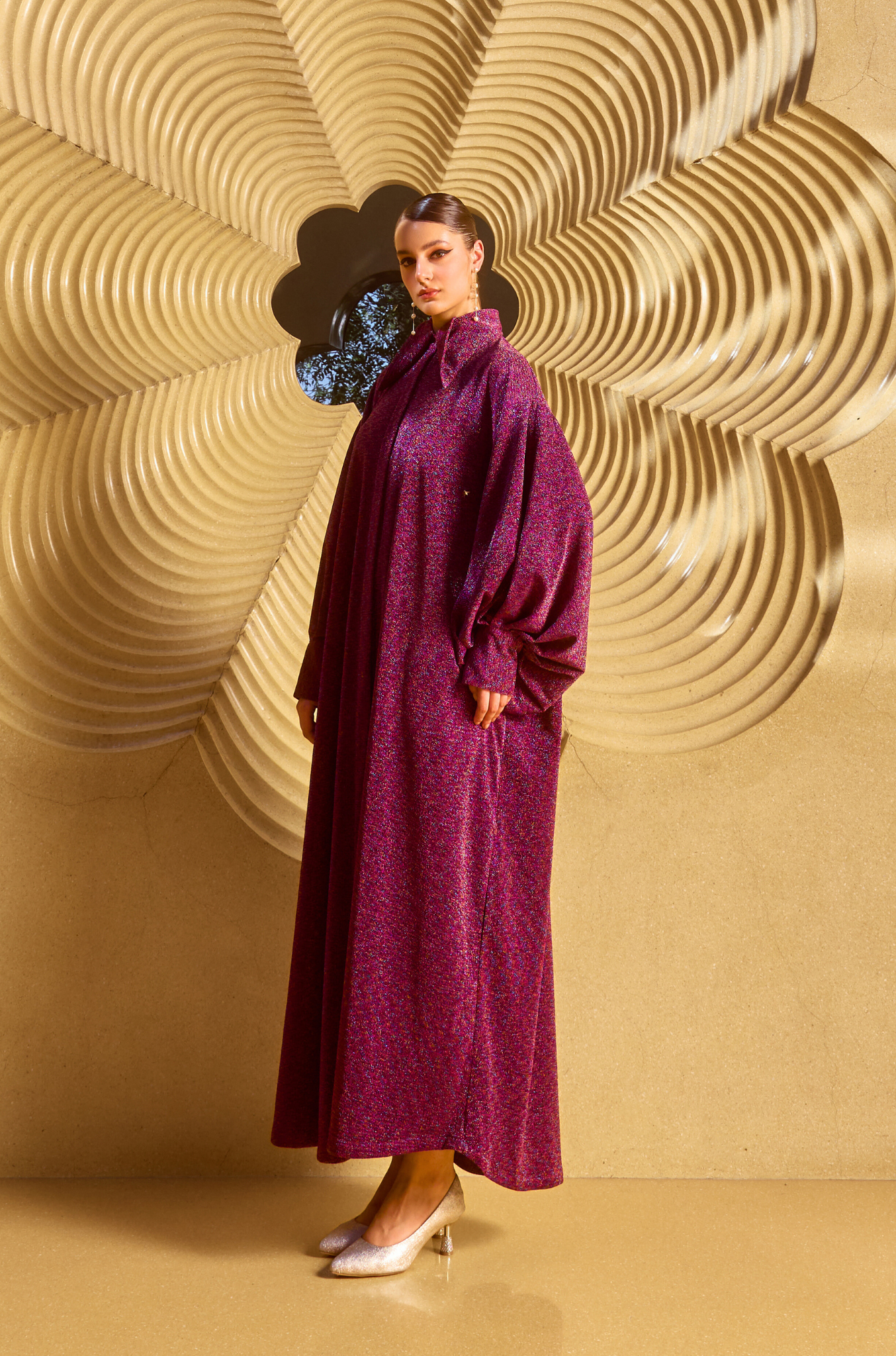 A luxurious masterpiece that exudes a captivating shine. This gown features an extravagant balloon sleeve and exaggerated collar in exquisite hues.