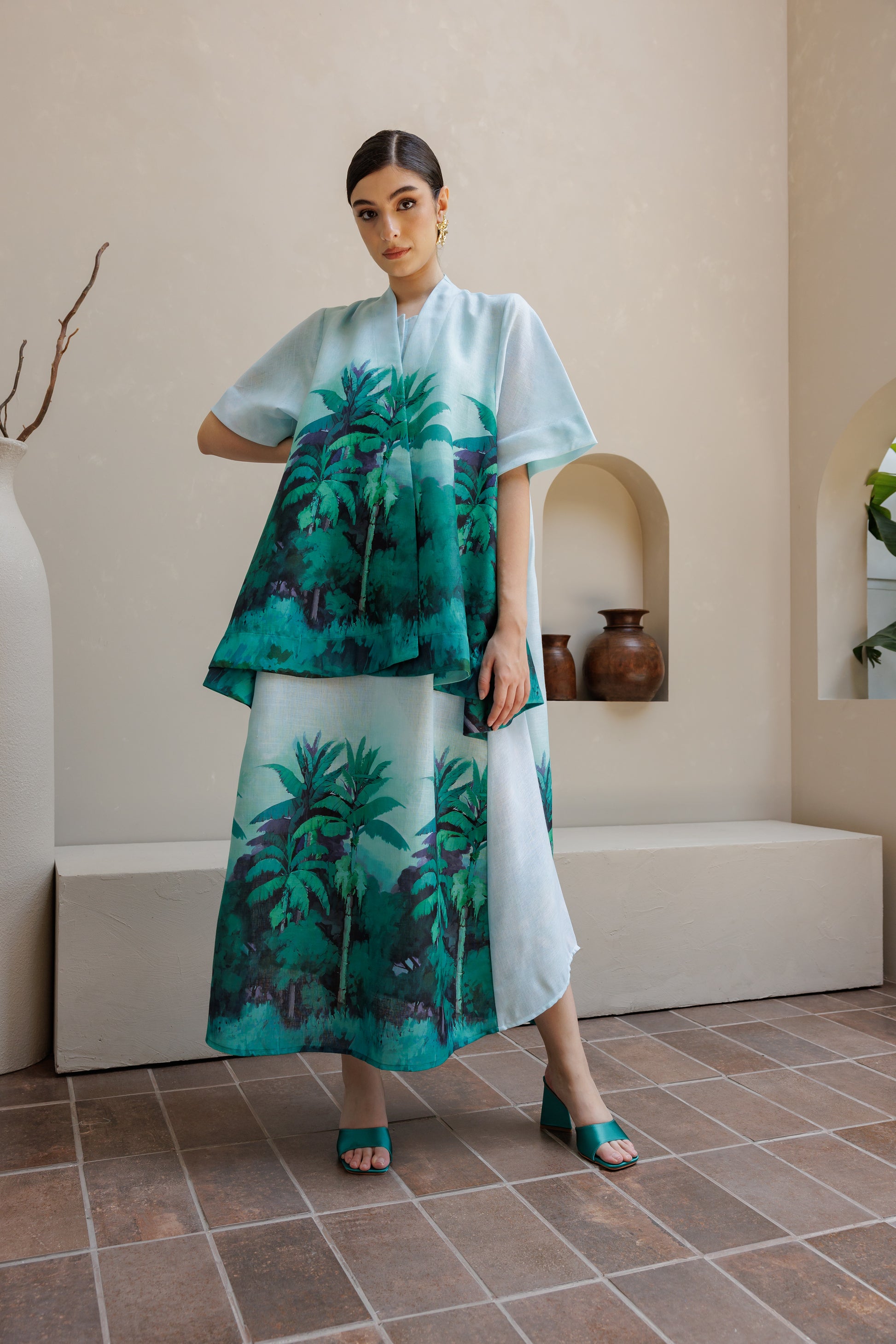 Elevate your fashion game with this linen shirt, featuring a delicate banana tree pattern and short sleeves for a polished yet casual look.