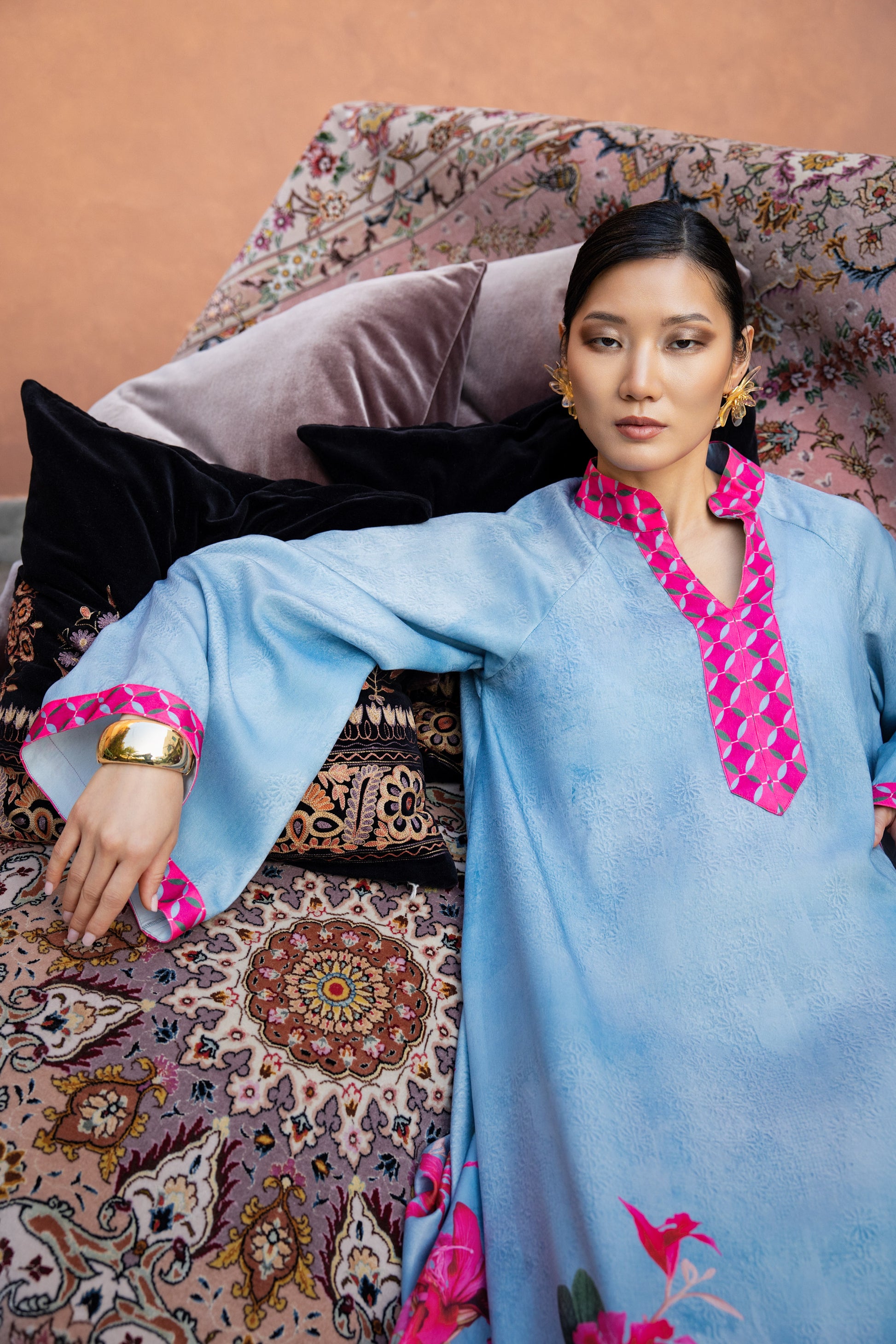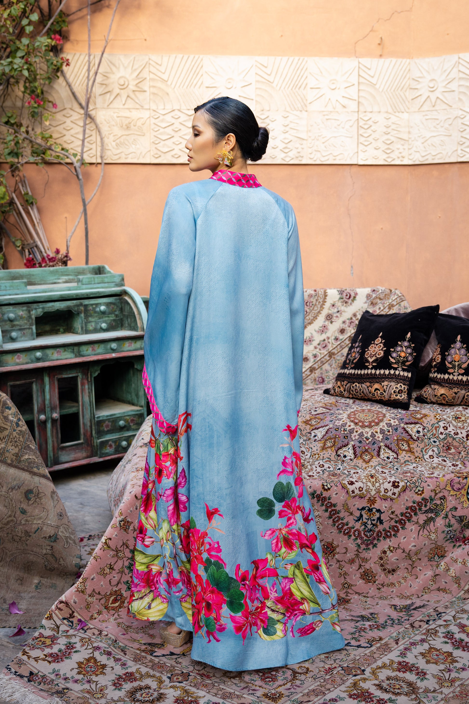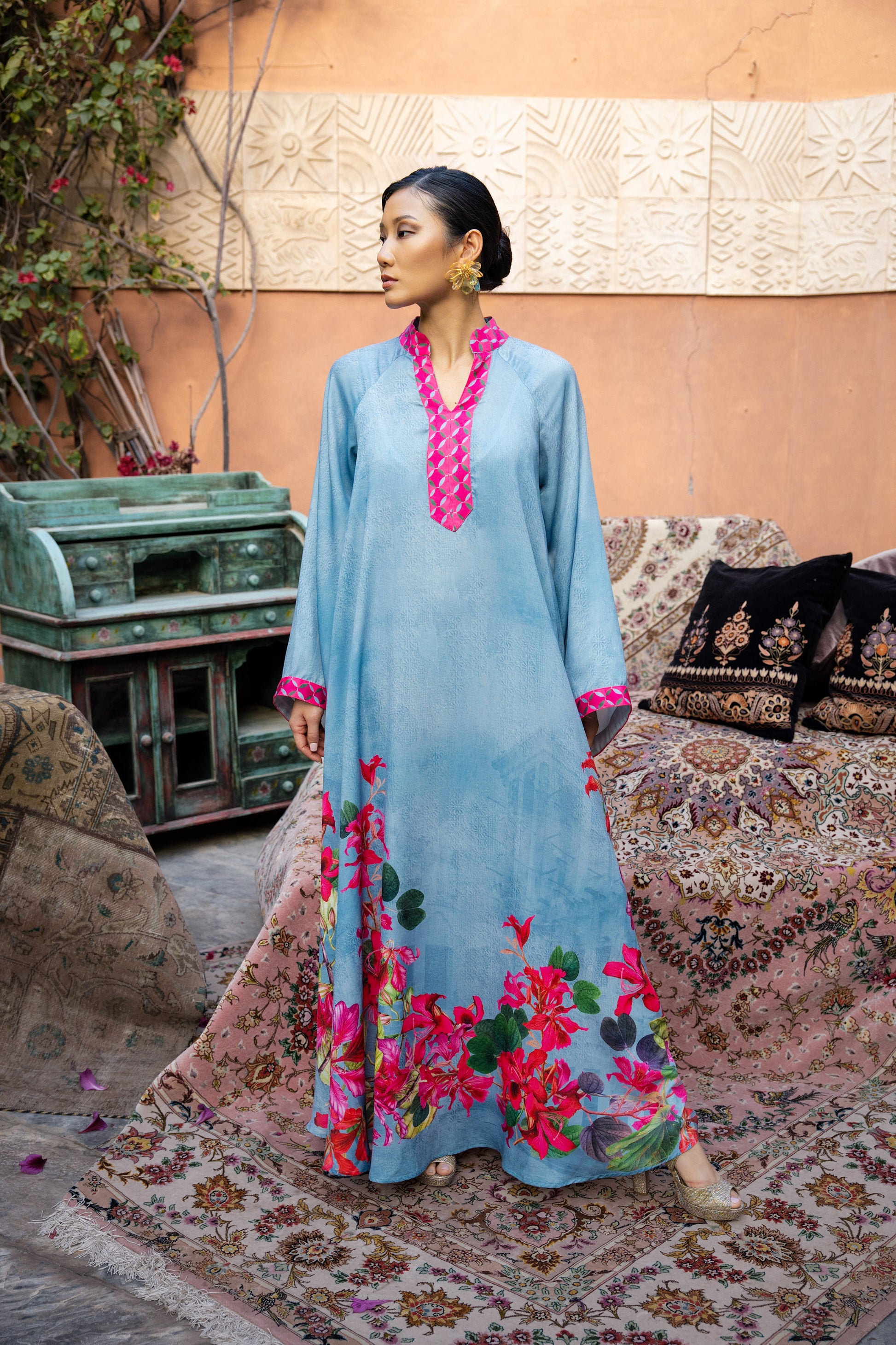 The Blooms of Bahrain loose jalabiya features a refined collar and a relaxed, flowing cut that drapes effortlessly. Crafted from soft, silky sky-blue fabric, it is highlighted with vibrant pink detailing inspired by Bahrain’s bougainvillea. The wide bell sleeves add graceful movement, creating a look of modern Bahraini elegance.