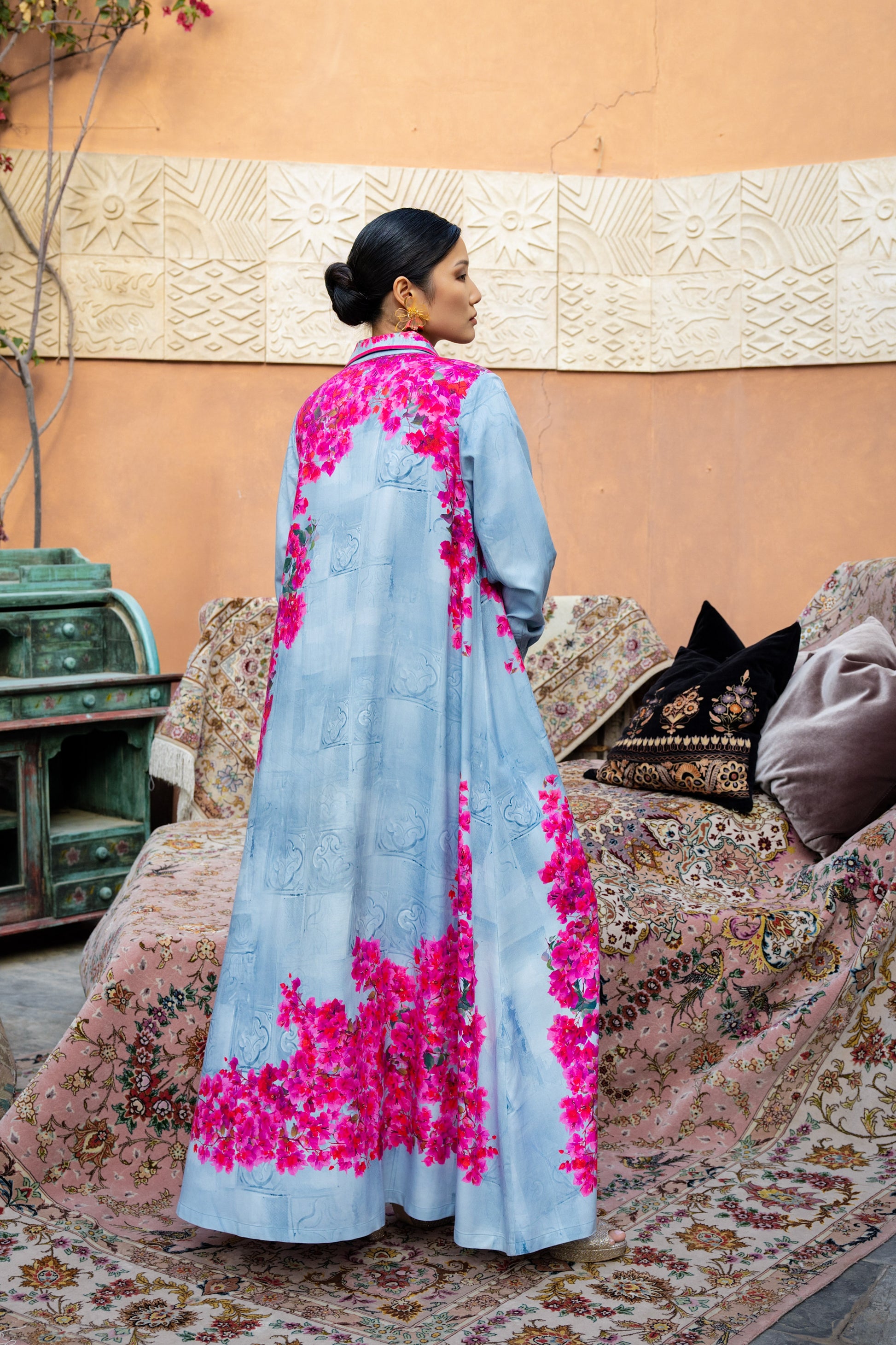 The Blooms of Bahrain – Collared Bougainvillea Dress is made from a soft linen-cotton blend, offering airy comfort and effortless movement. Sky-blue hues are enriched with vibrant pink bougainvillea-inspired florals. Designed with a classic collar, long cuffed sleeves, this loose silhouette blends modest elegance with contemporary Bahraini charm