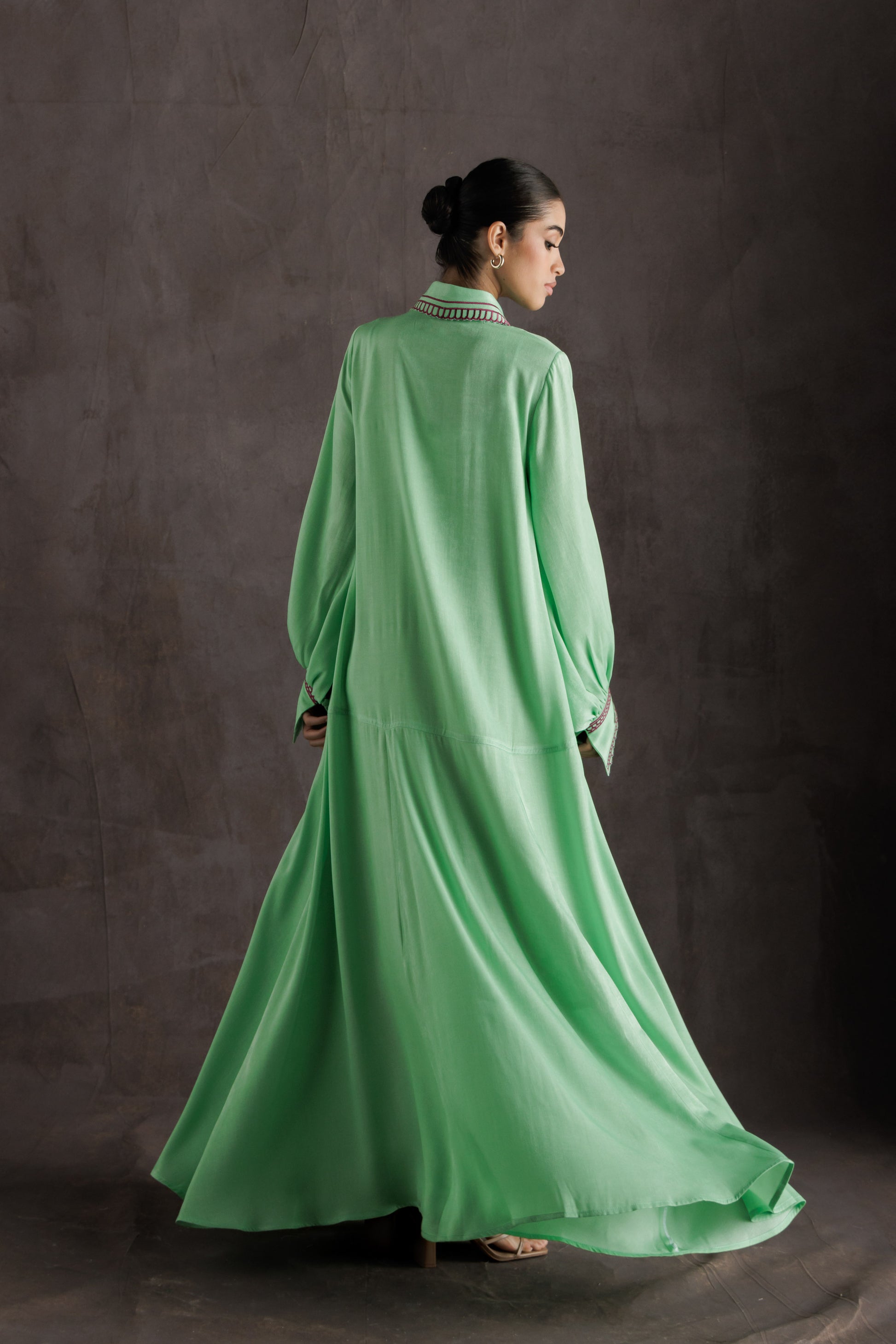 Indulge in the exquisite elegance of our green Buttoned Floral Embroidered Jalabiya, featuring a buttoned collar, delicate puff sleeves, and intricate embroidered chest and cuff detailing. Its flowy and soft design will envelop you in luxurious comfort.