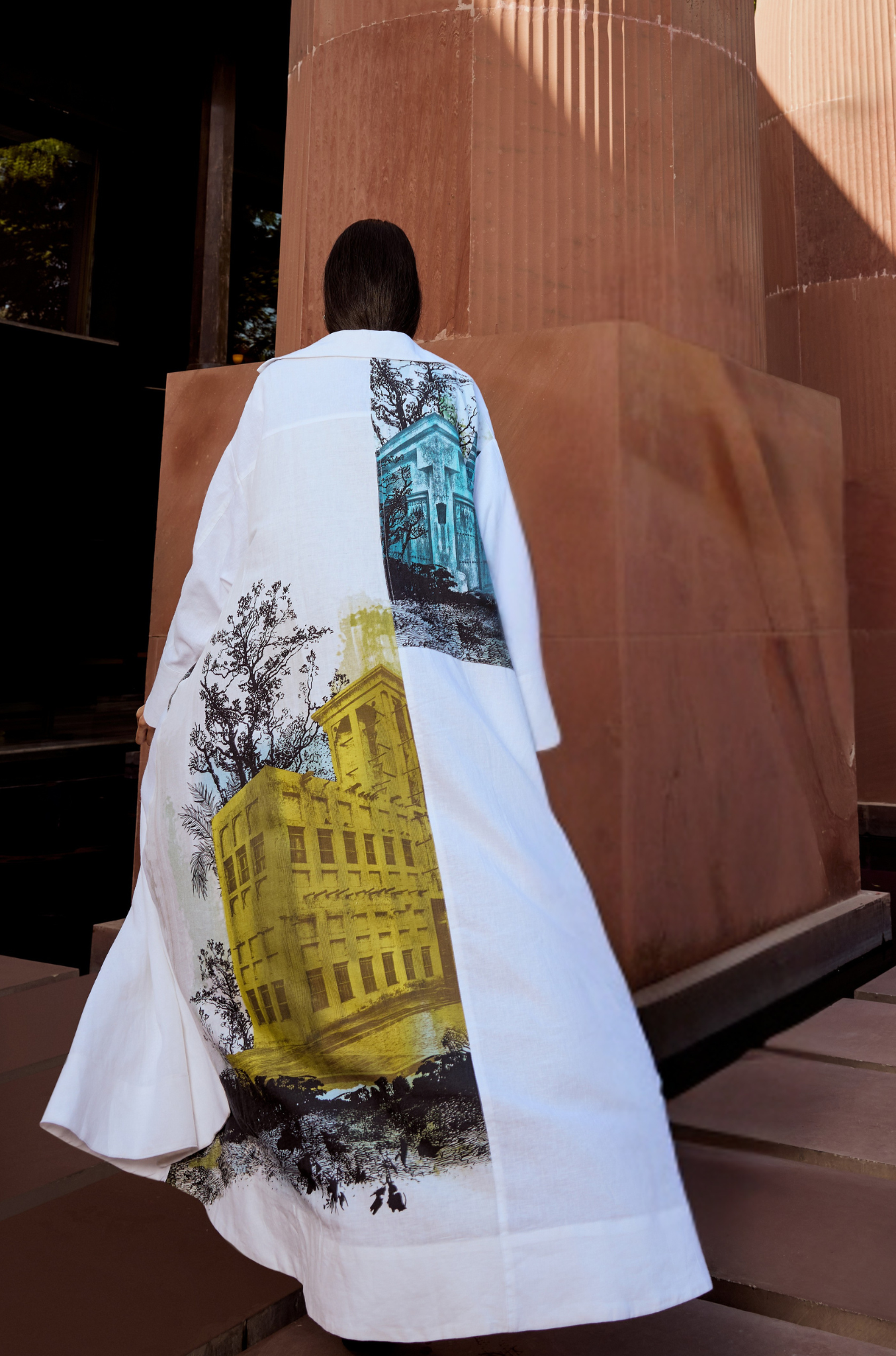 Bold printed open coat crafted from breathable linens, featuring an open long coat.
