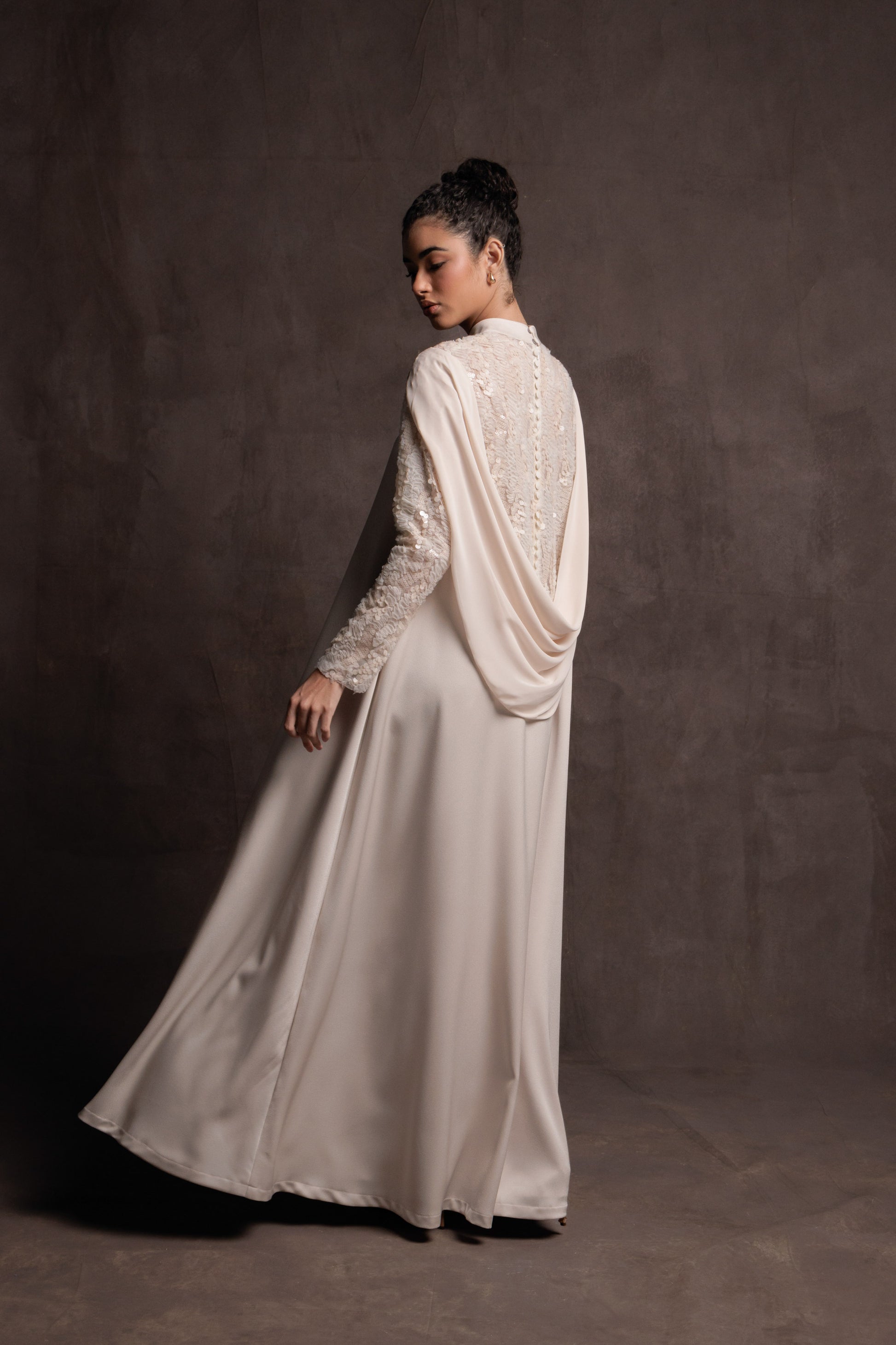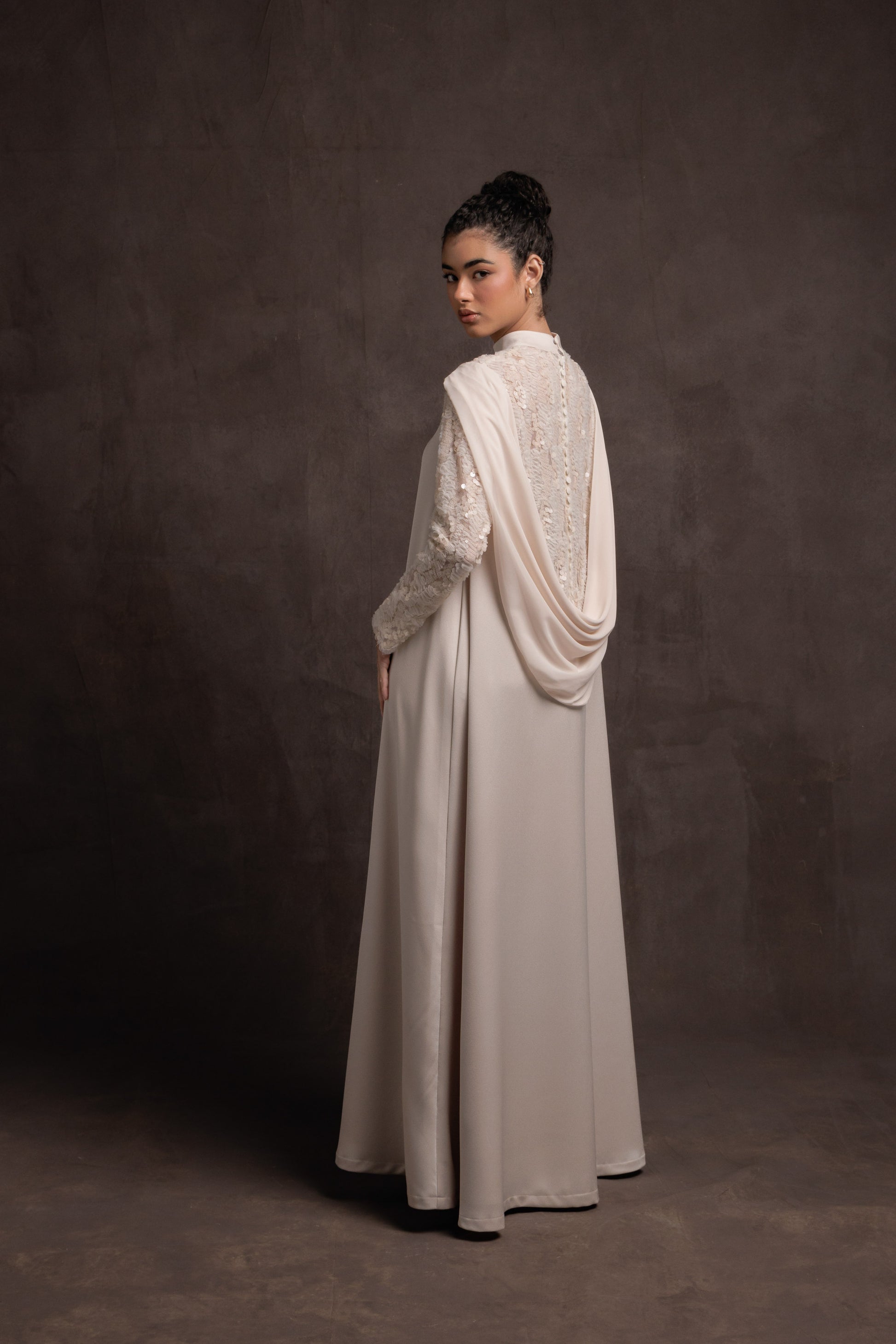 A creamy gown with sequin-embroidered details and a soft draped back, inspired by the fluid elegance of Bahraini pearls. A timeless silhouette that balances refinement and modern femininity.
