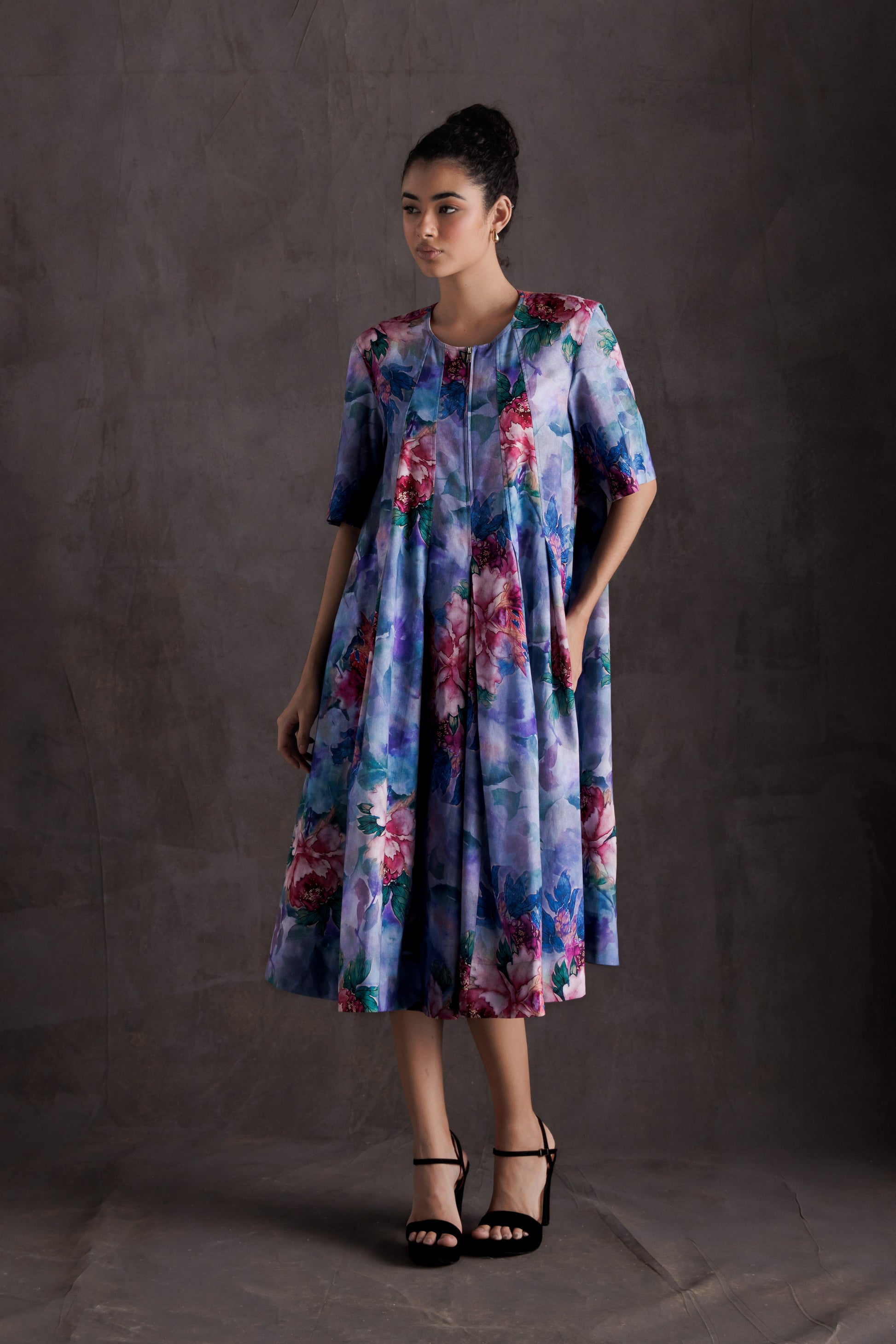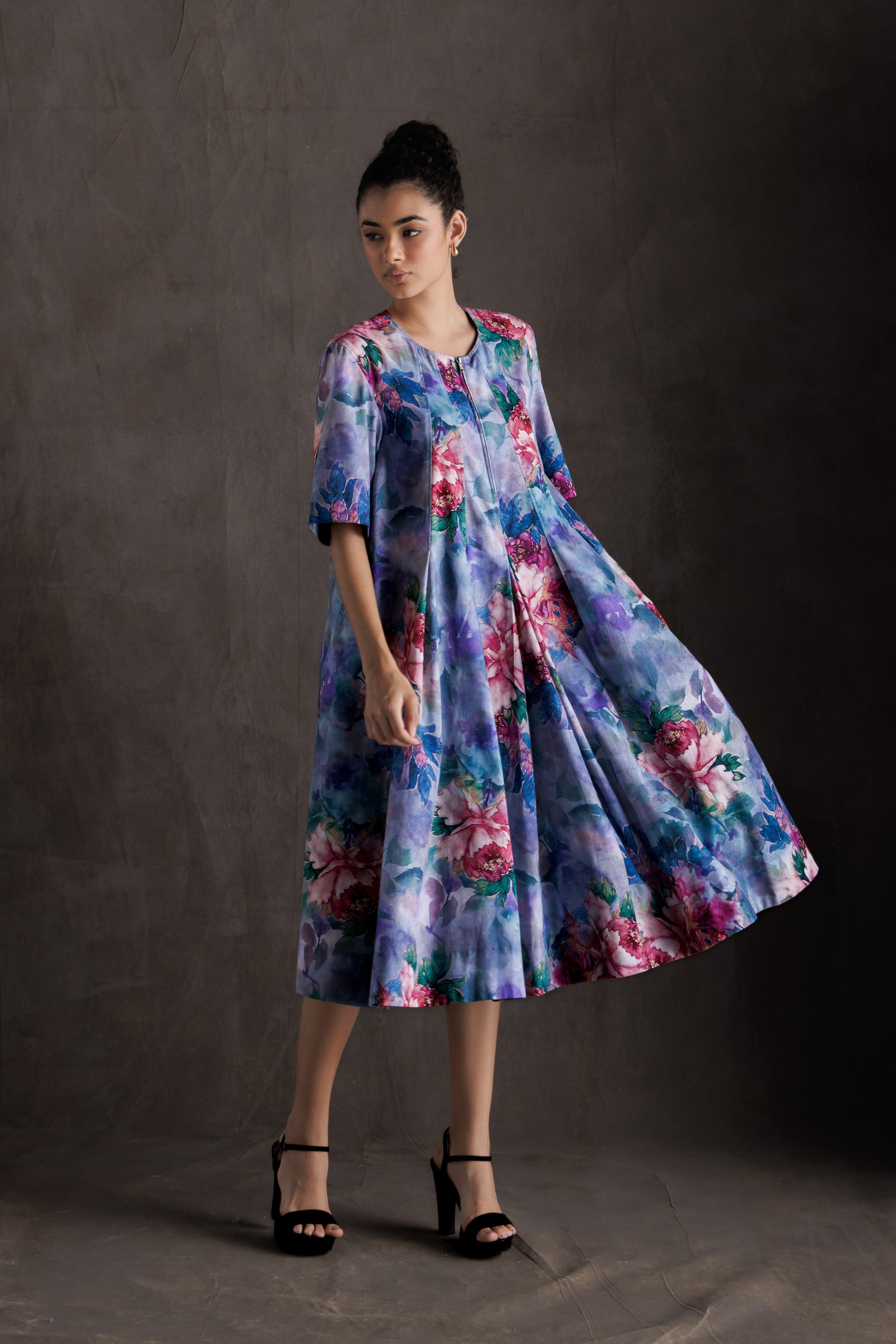 This elegant, loose-fitting dress features a delicate floral pattern in soft purple and blue tones, accented by bold pink and magenta blossoms. It includes short sleeves, a refined round neckline, and a convenient front zipper. The pleated design offers a graceful, flowing silhouette, perfect for casual sophistication.