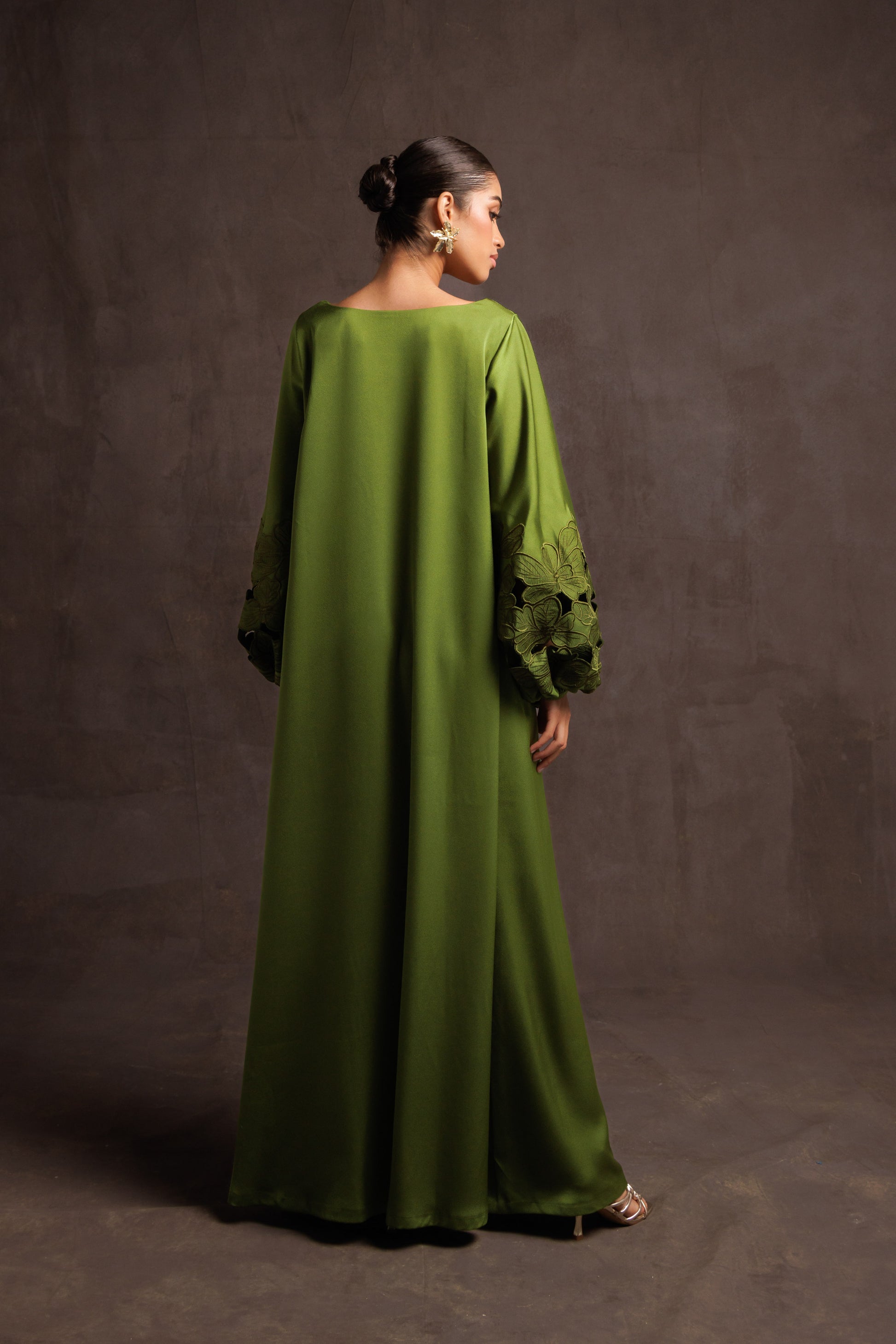 Crafted from vibrant crepe fabric, this dress showcases floral broderie anglaise cutouts that resemble petals. It features flower-inspired sleeves and gentle floral embellishments for an elegant finish.