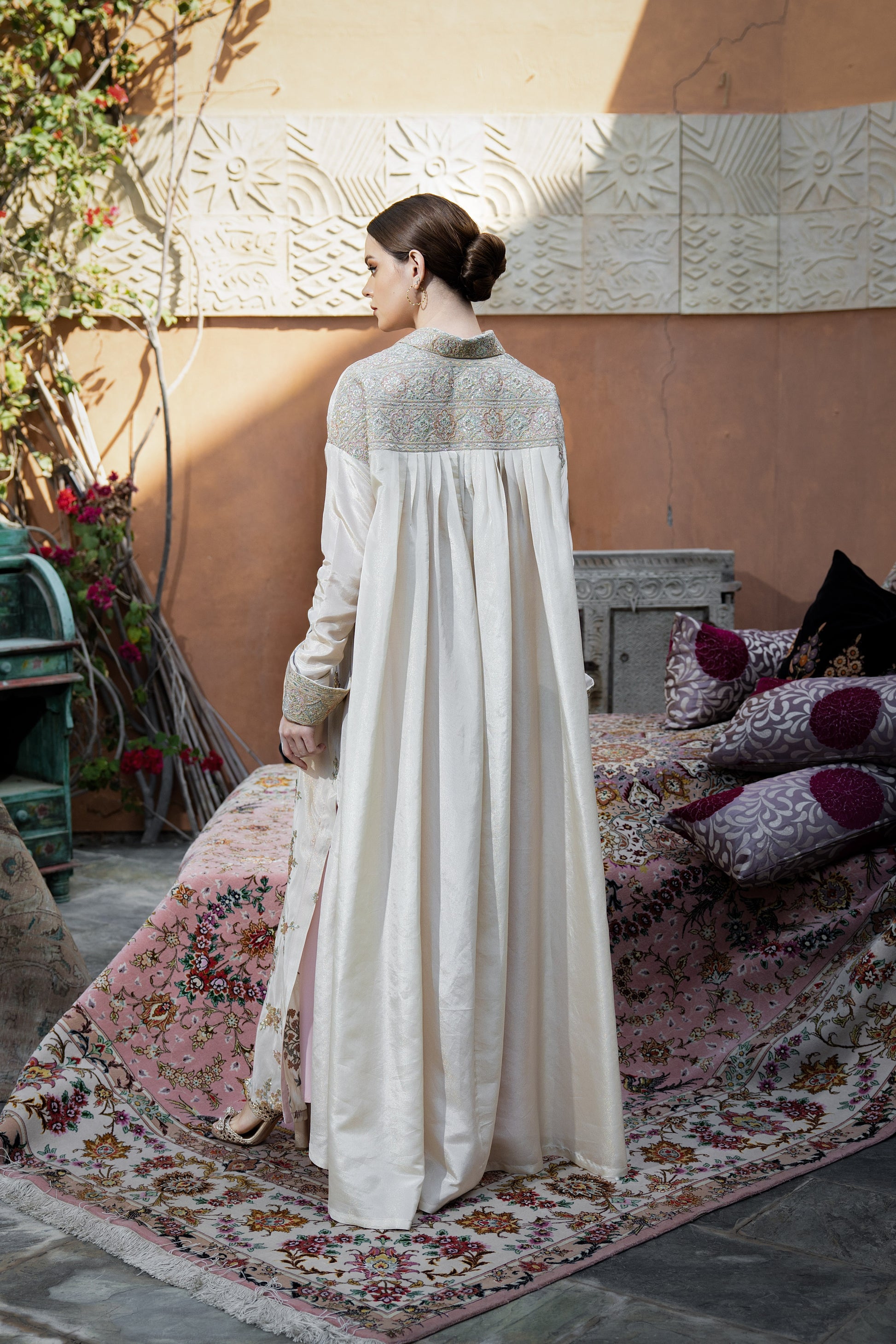 An elegant ivory evening dress designed in a flowing long-shirt silhouette, adorned with delicate floral embroidery scattered across the fabric. The sleeves feature intricately embroidered cuffs that add refined detail, while the embellished yoke enhances the structured neckline. while the pleated back creates a flowy. The soft tons of gold and blush create a subtle shimmer, making this piece ideal for graceful Ramadan evenings and festive gatherings.