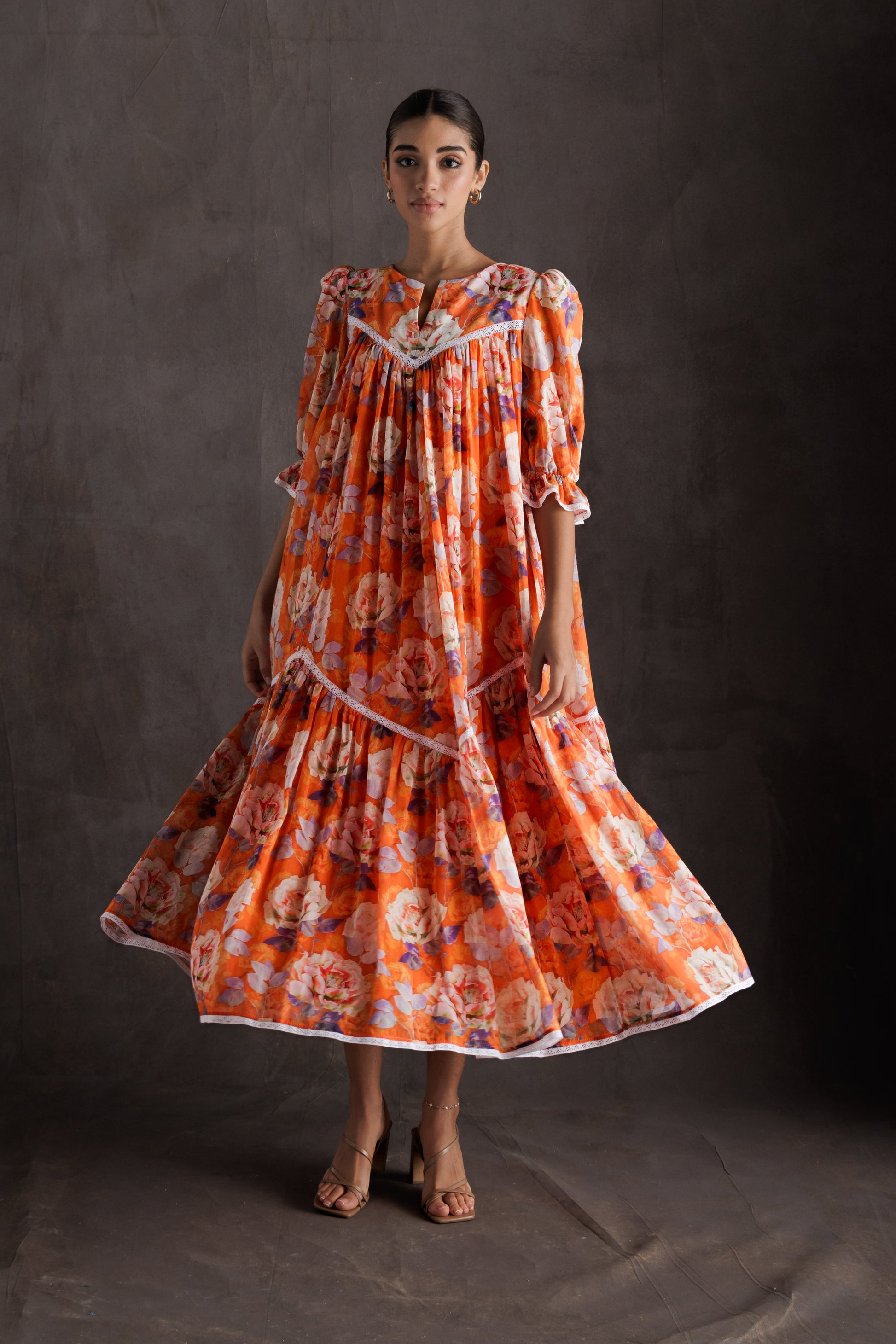This elegant and feminine dress features delicate chest lace detailing, a graceful flowy look, and charming puffed sleeves. Perfect for any occasion, it will make you feel confident and beautiful.