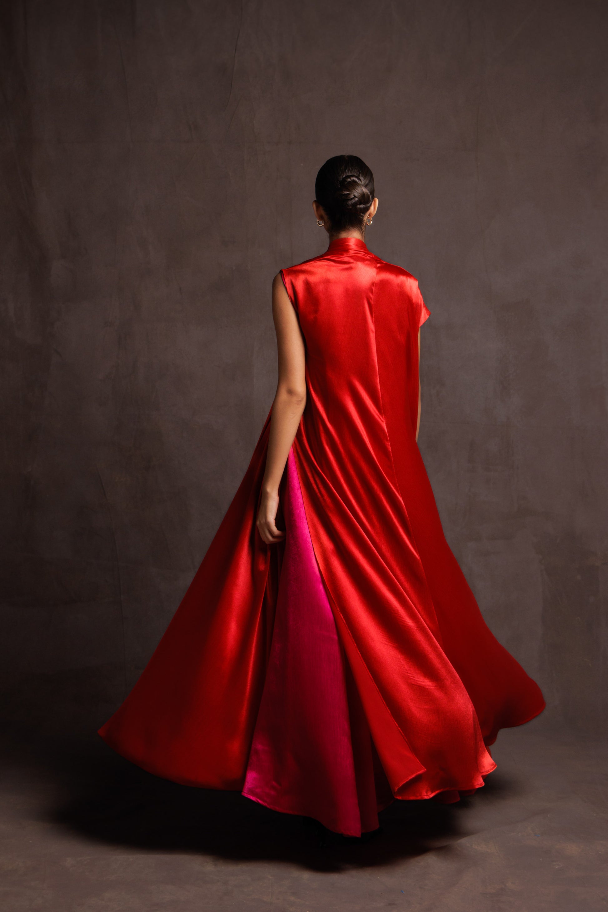 This red draped vest merged with a fuchsia  V neck dress  serves an elegant look.